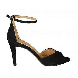 Sandalia con cinturon al tobillo y estrás para mujer en piel laminada gris acero y rafia negra tacon 5