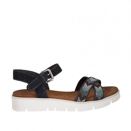 Sandalia para mujer en piel y gamuza negra con estras, plataforma y cuña 7