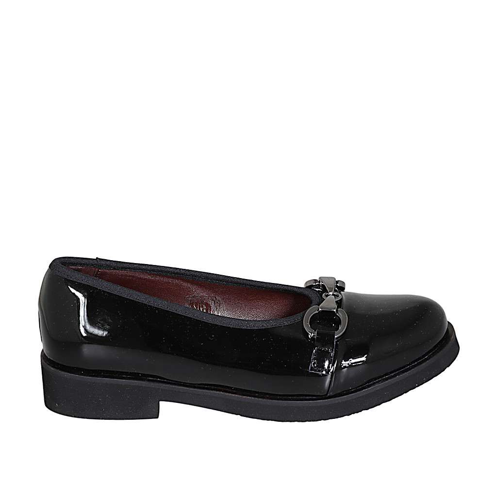 Ballerinaschuh für Damen aus schwarzem Lackleder mit Kappe und Accessoire Absatz 3