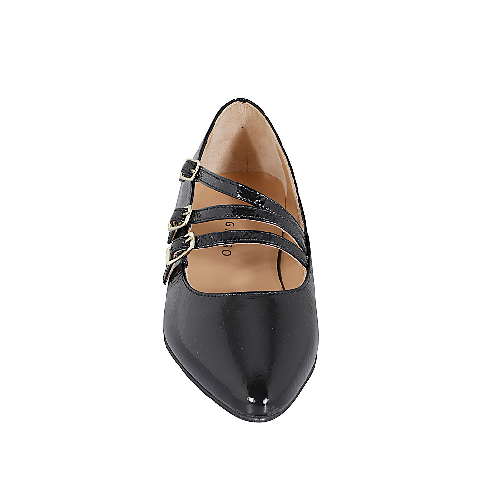 Mary Jane Ballerinaschuhe mit spitzer Spitze und drei Riemen aus schwarzem Lackleder Absatz 2