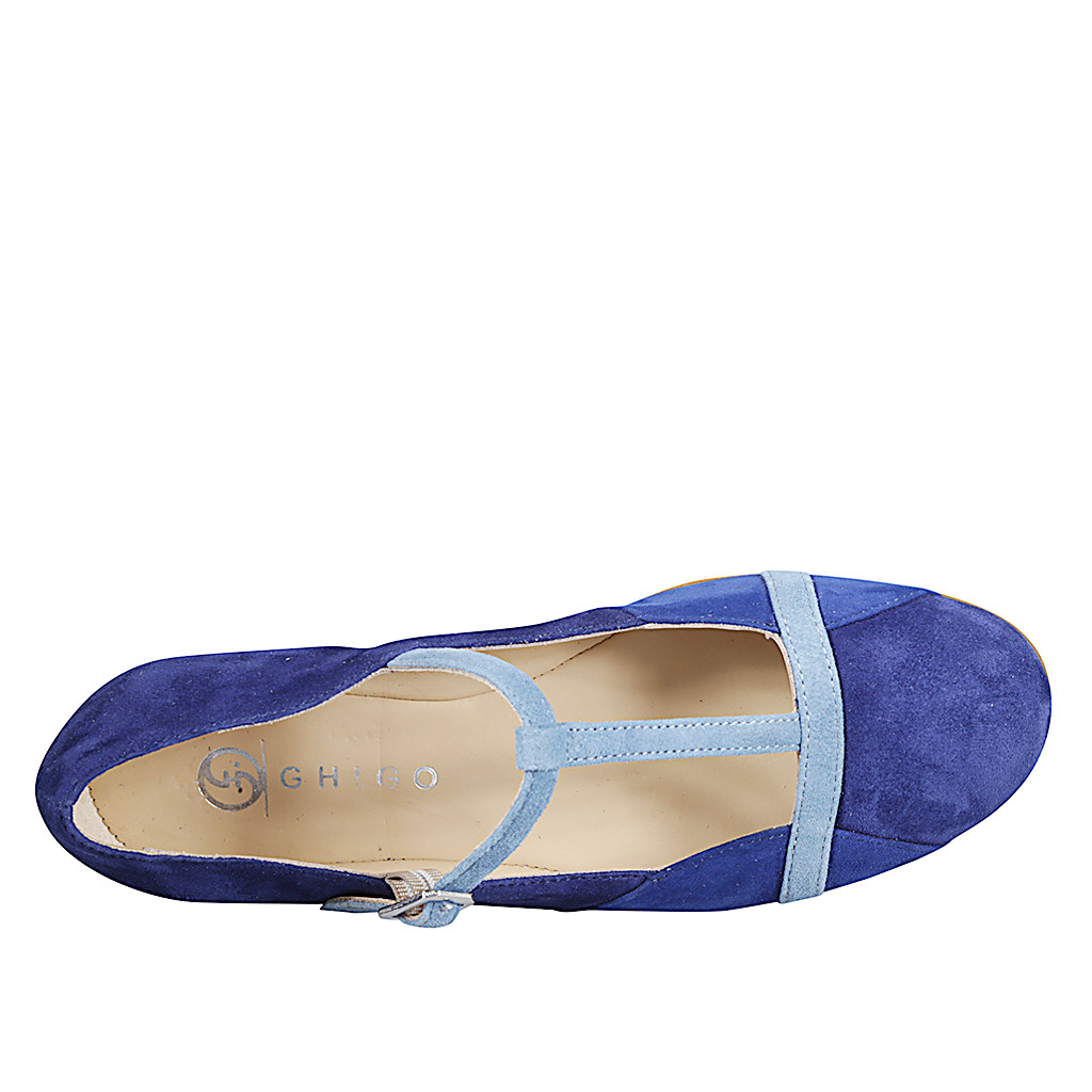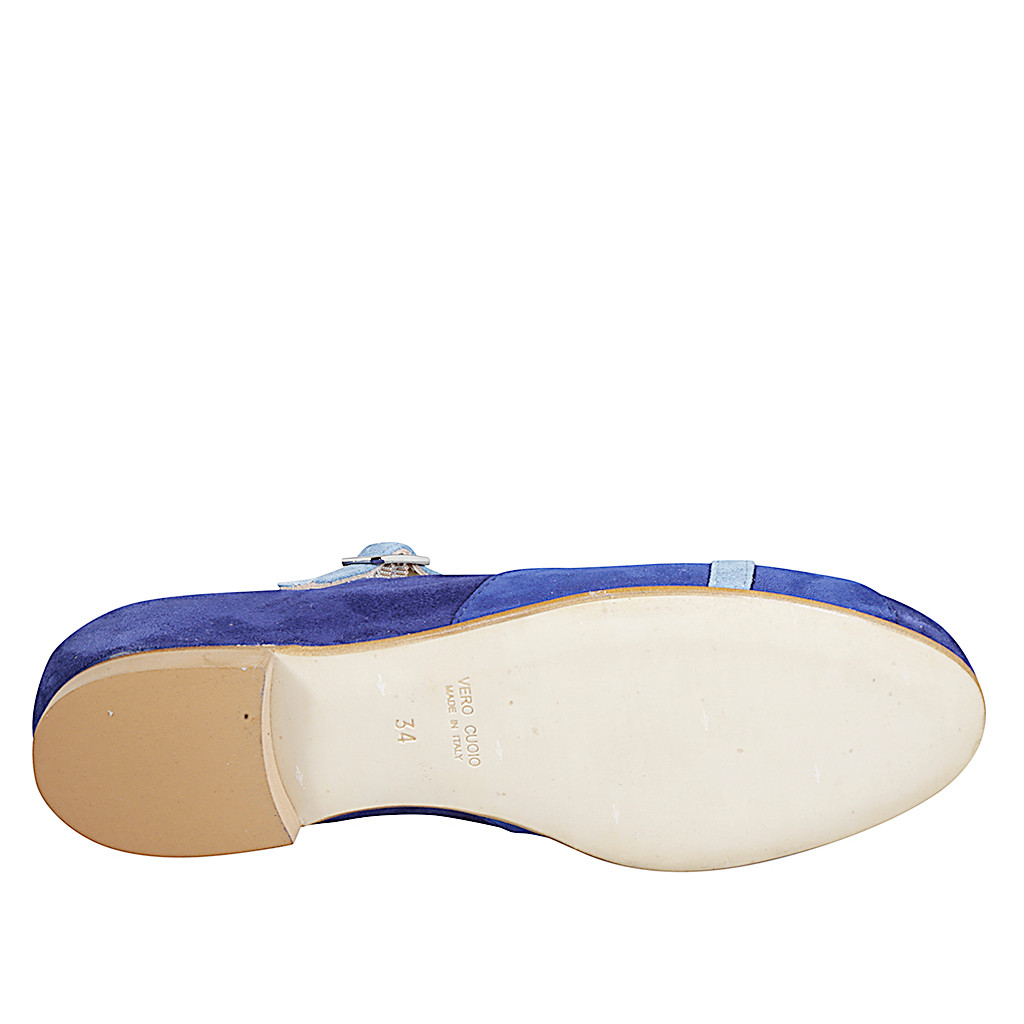 Damenballerina mit T-Steg aus blauem, kobaltblauem und hellblaumen Wildleder Absatz 1