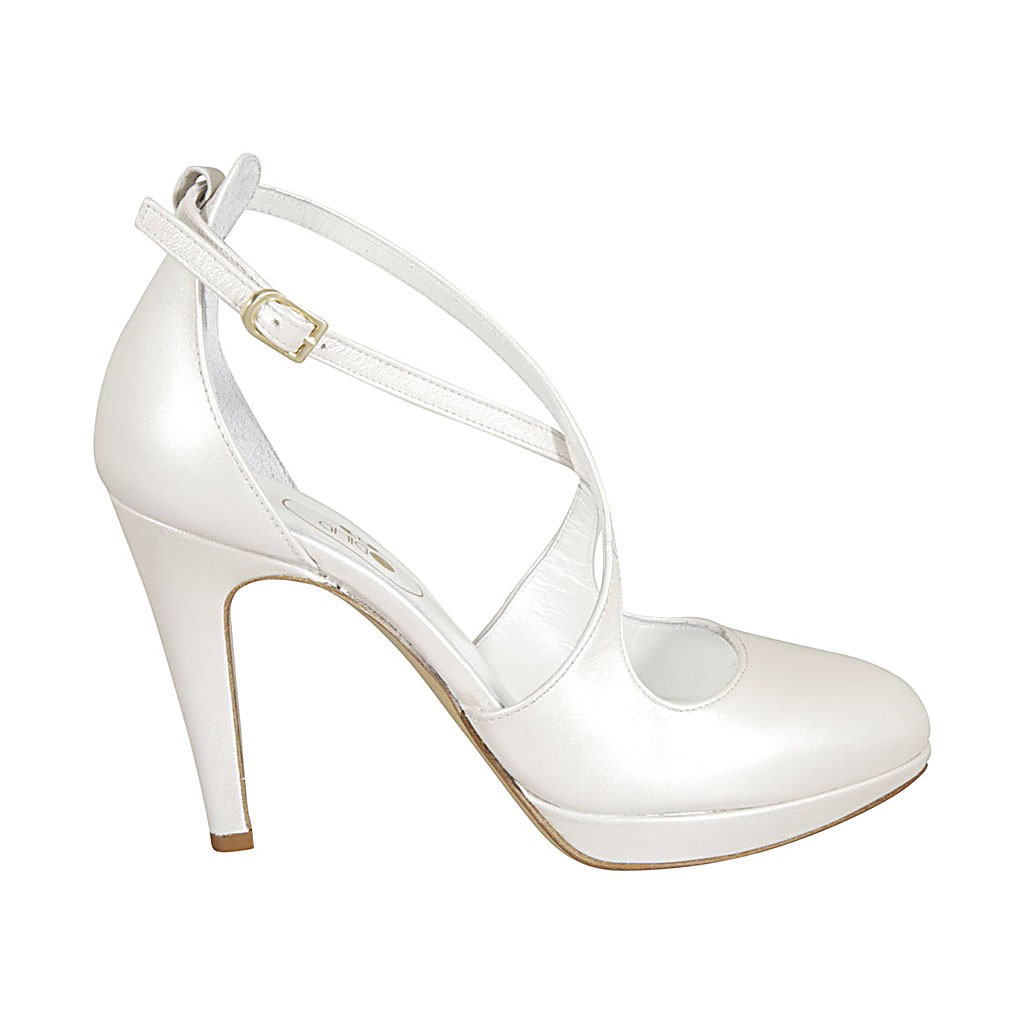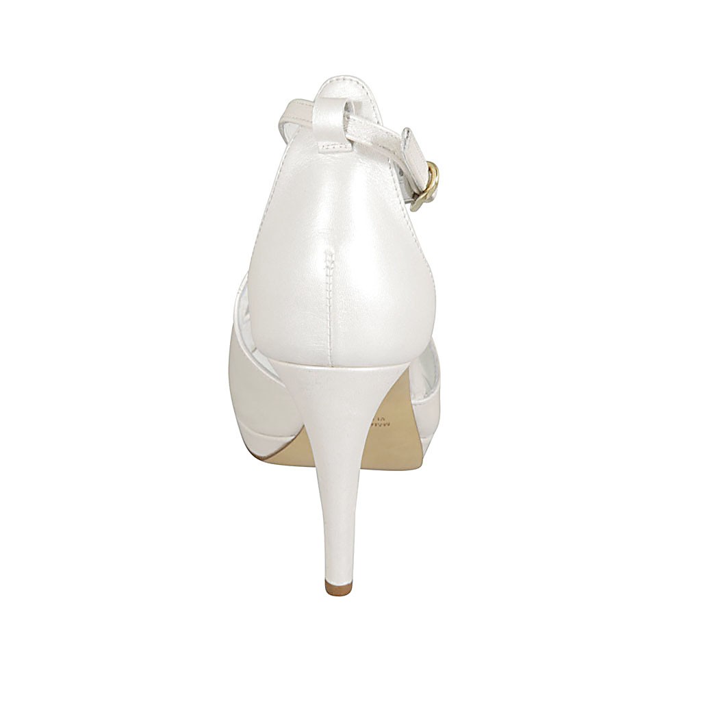 Offener Damenschuh aus perligem elfenbeinfarbenem Leder mit Riem und Plateau Absatz 10 - Verfügbare Größen:  31, 32, 34, 42, 43, 44, 45, 46