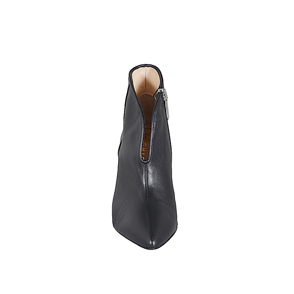 Spitzer hochgeschlossener Damenschuh mit V-Schnitt aus schwarzem Leder mit Reissverschluss Absatz 7