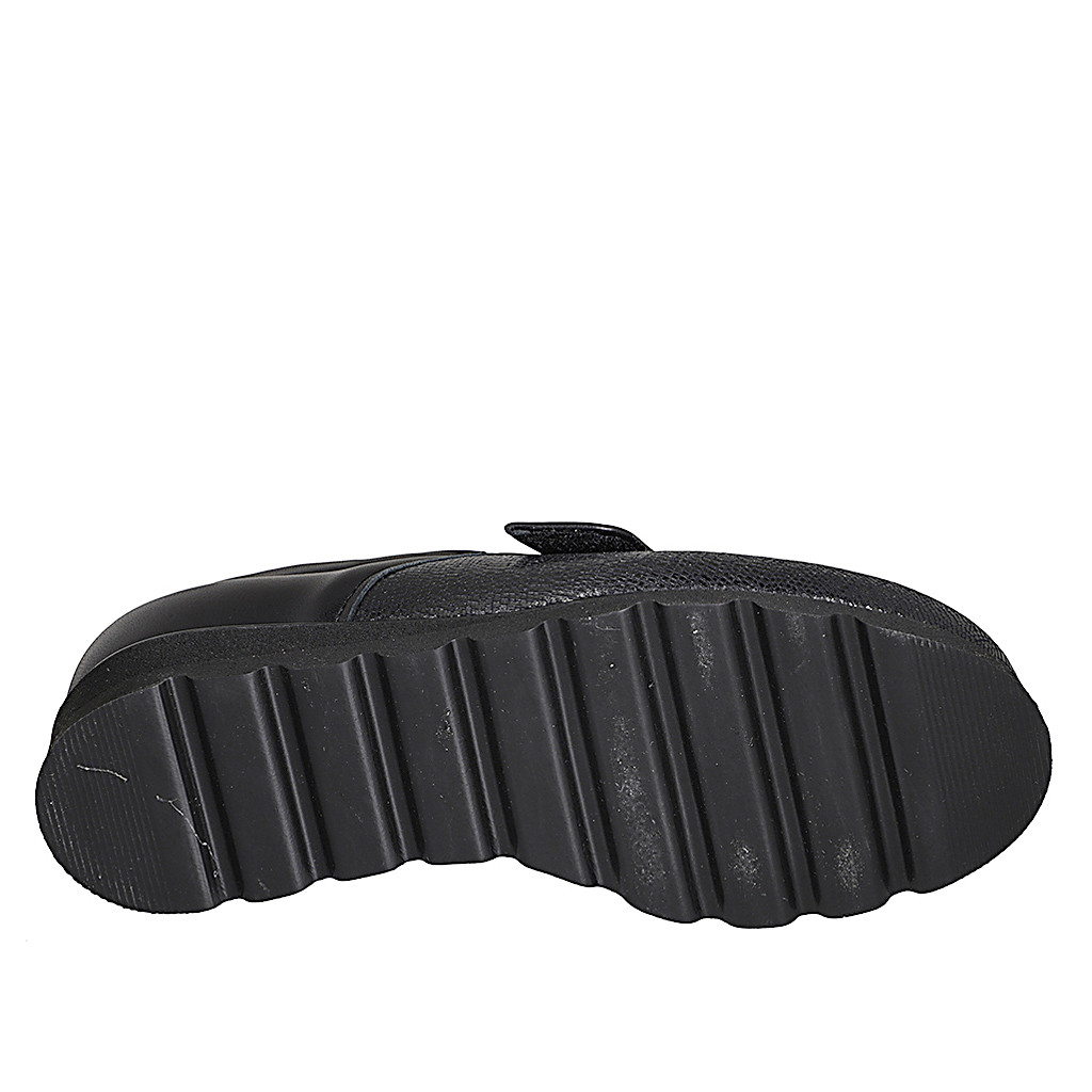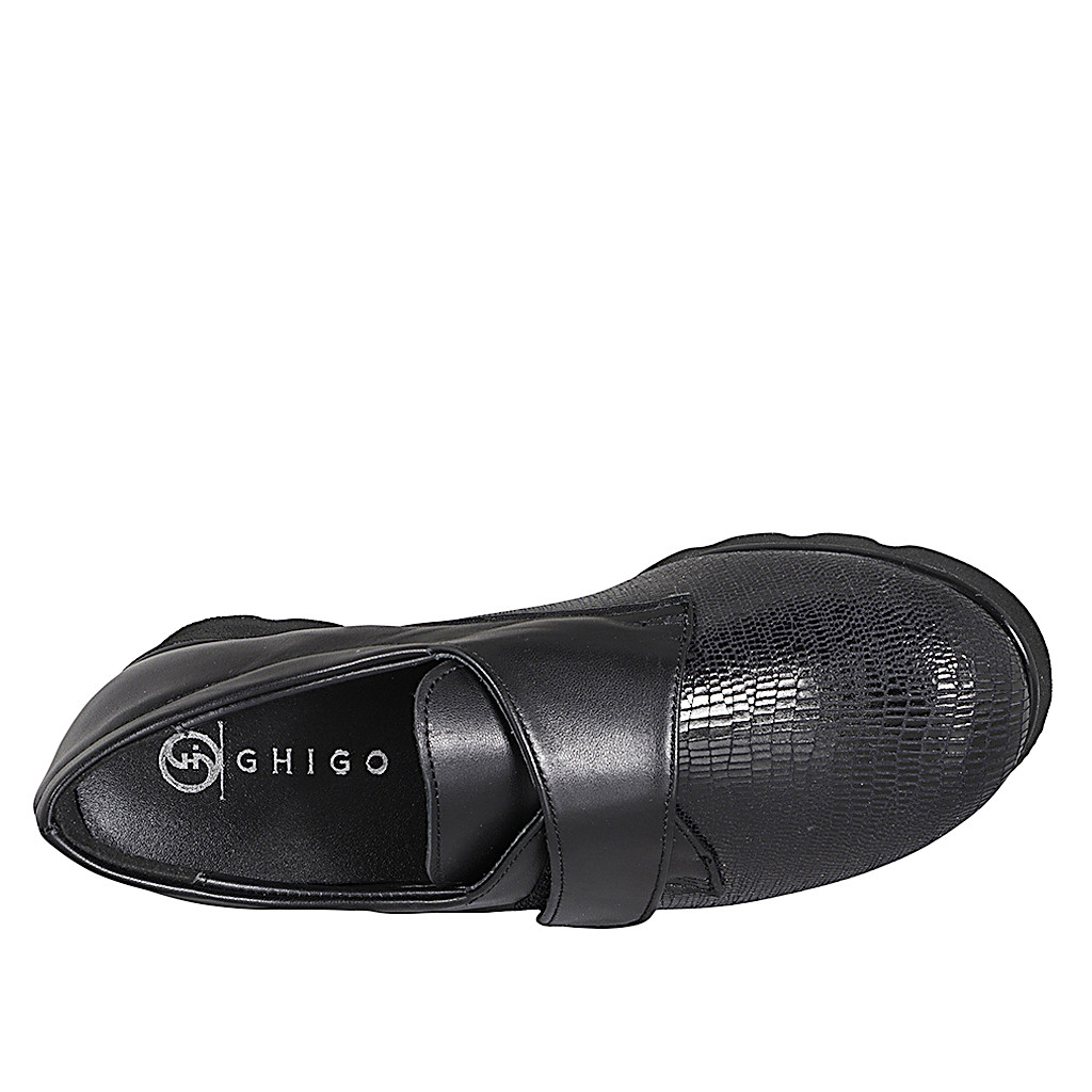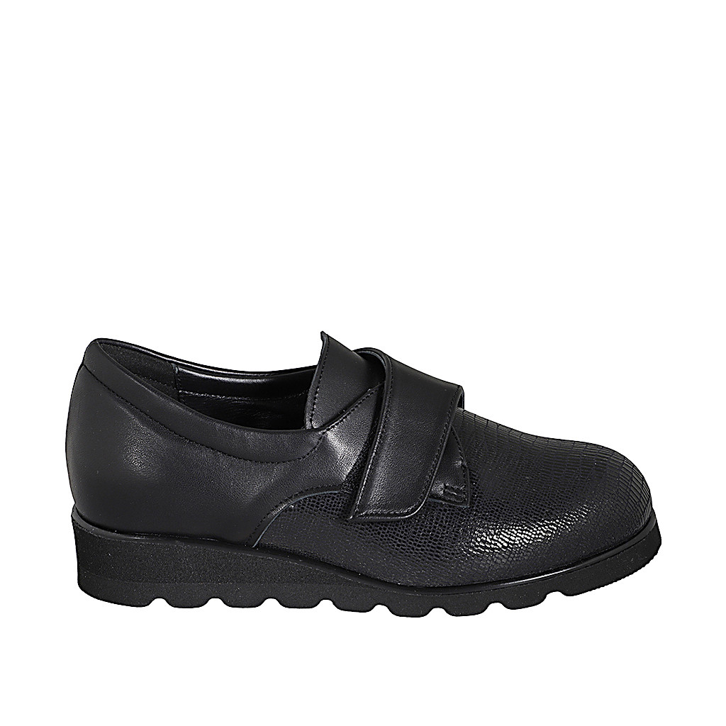 Damenschuh mit Klettverschluss und abnehmbarer Innensohle aus schwarzem Leder und bedrucktem Stretchleder Keilabsatz 3