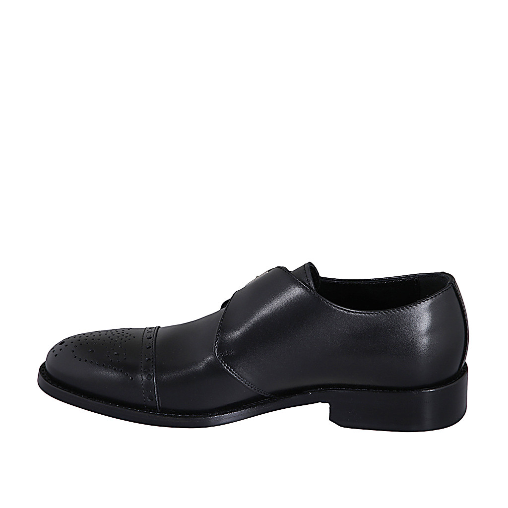 Herrenschuh mit seitlicher Schnalle und Broguemusterkappe aus schwarzem Leder