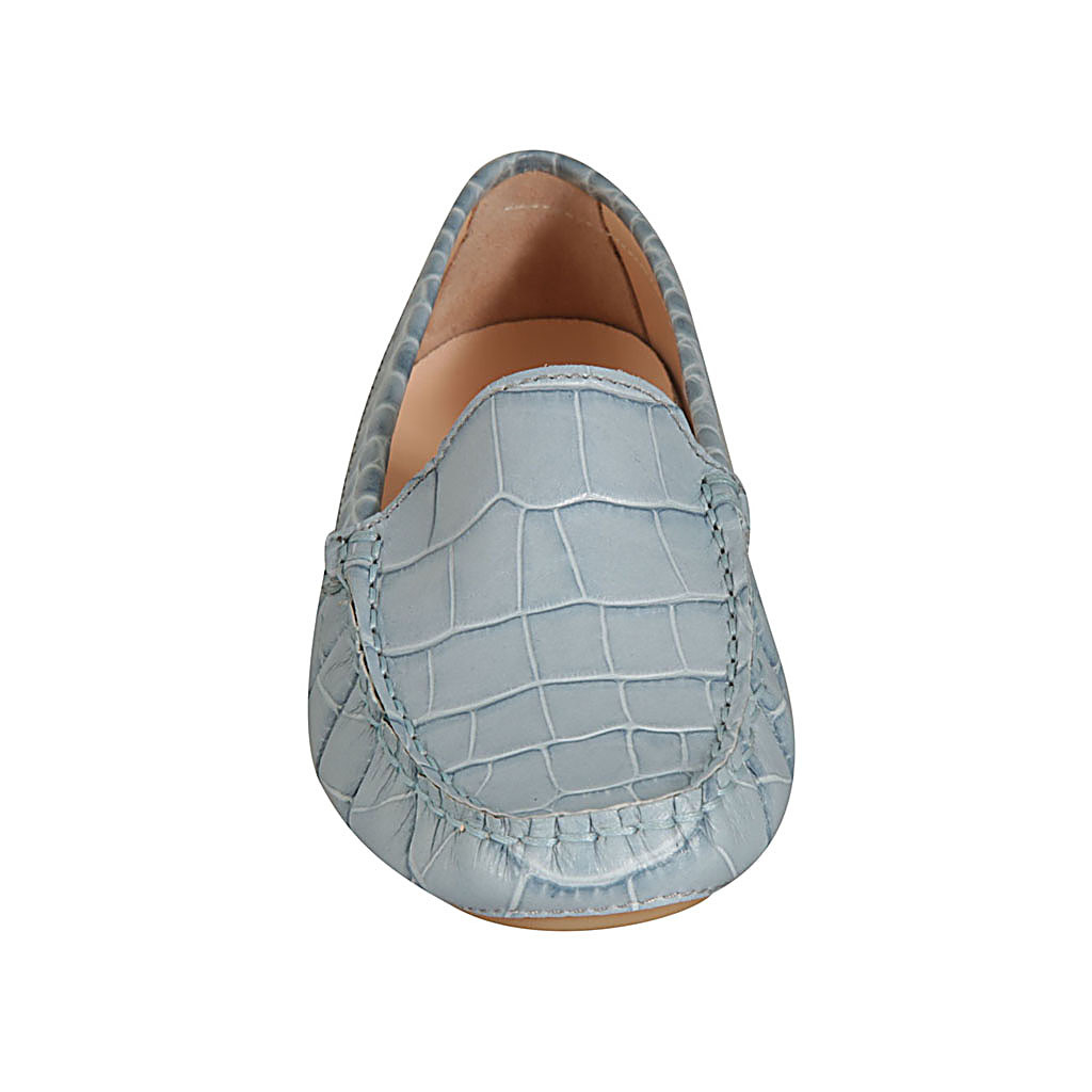 Damenmokassin mit herausnehmbarer Innensohle aus hellblauem bedrucktem Leder
