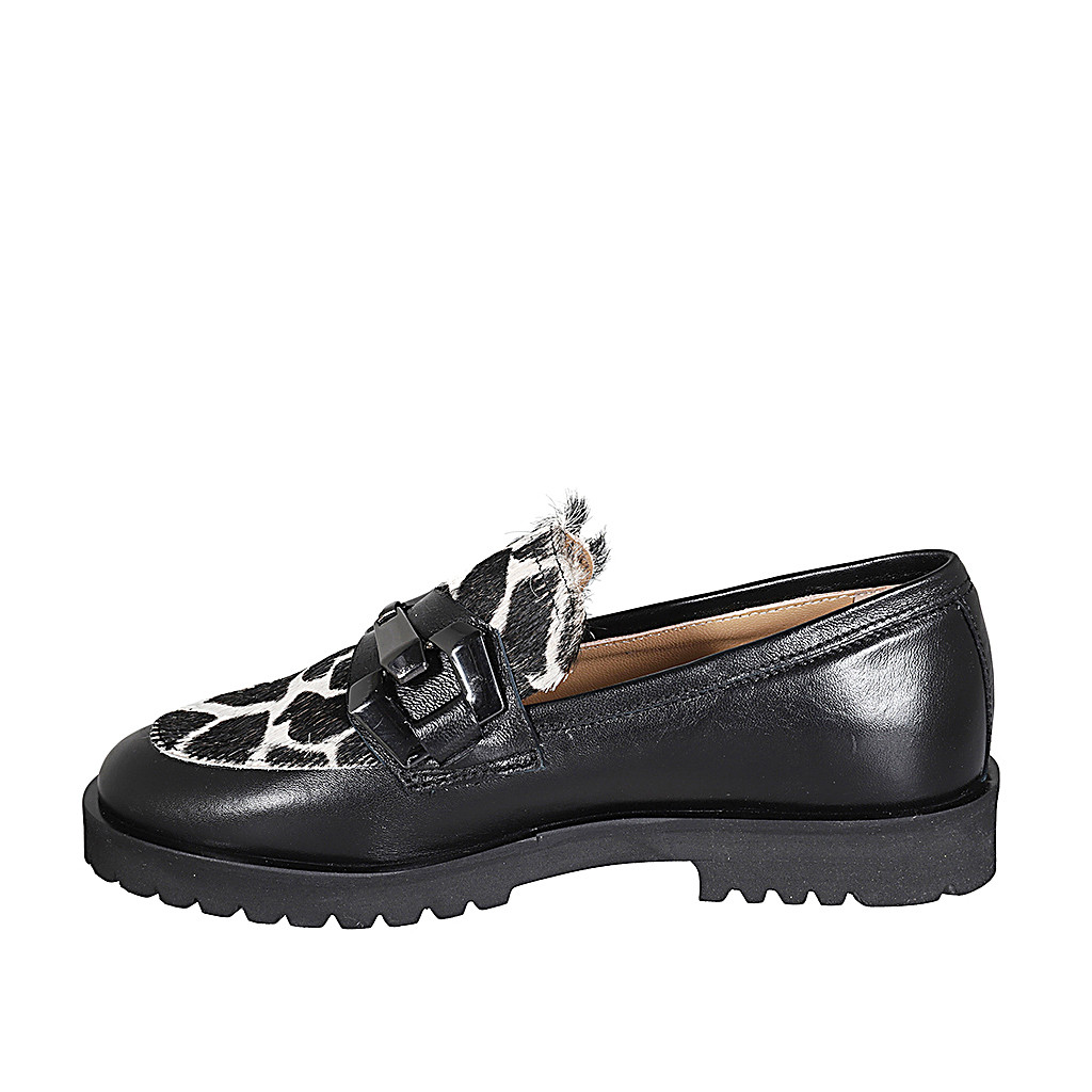 Damenmokassin mit Accessoire aus schwarzem und schwarzweißem Kalbfell Absatz 3