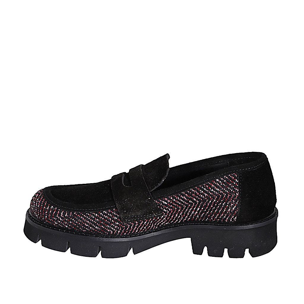 Damenmokassin aus schwarzem Wildleder und bourdeauxfarbenem Fischgrätstoff Absatz 3