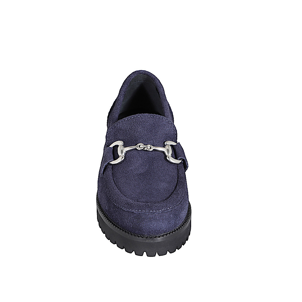 Damensandale aus blaugrauem perlmuttartigem Leder und buntbedrucktem Leder Keilabsatz 5