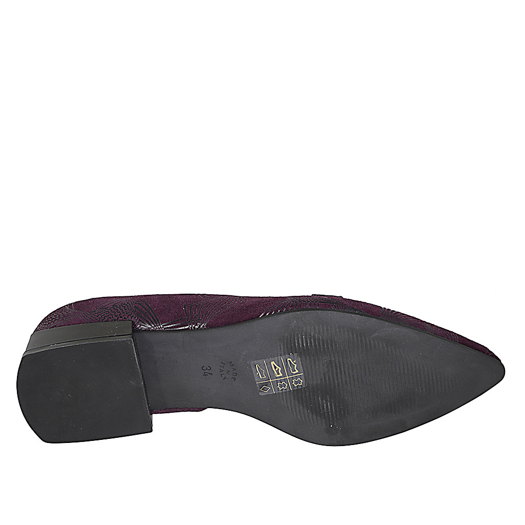 Spitzer Mokassinschuh für Damen mit Accessoire aus violettem Wild- und schwarzem Lackleder Absatz 3