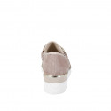 Damenmokassins mit Keilabsatz, Gummiband und goldenem Accessoire aus taupefarbenem Wildleder und beigem Leder, Keilabsatz 4
