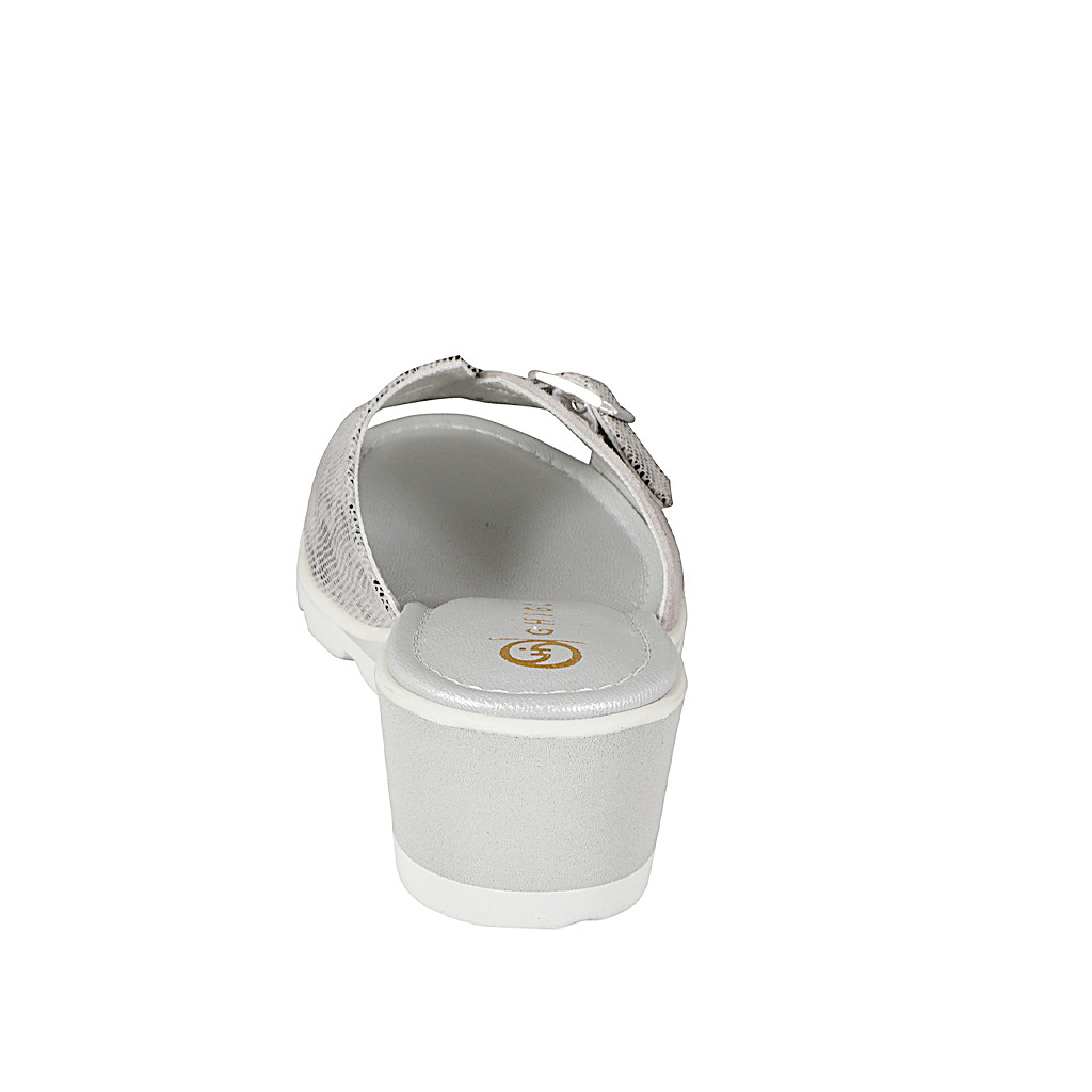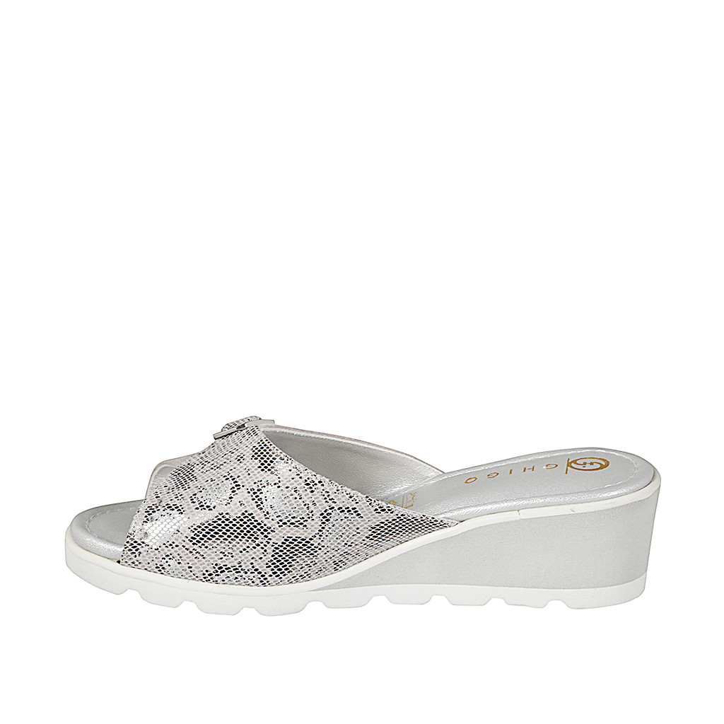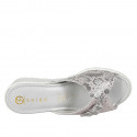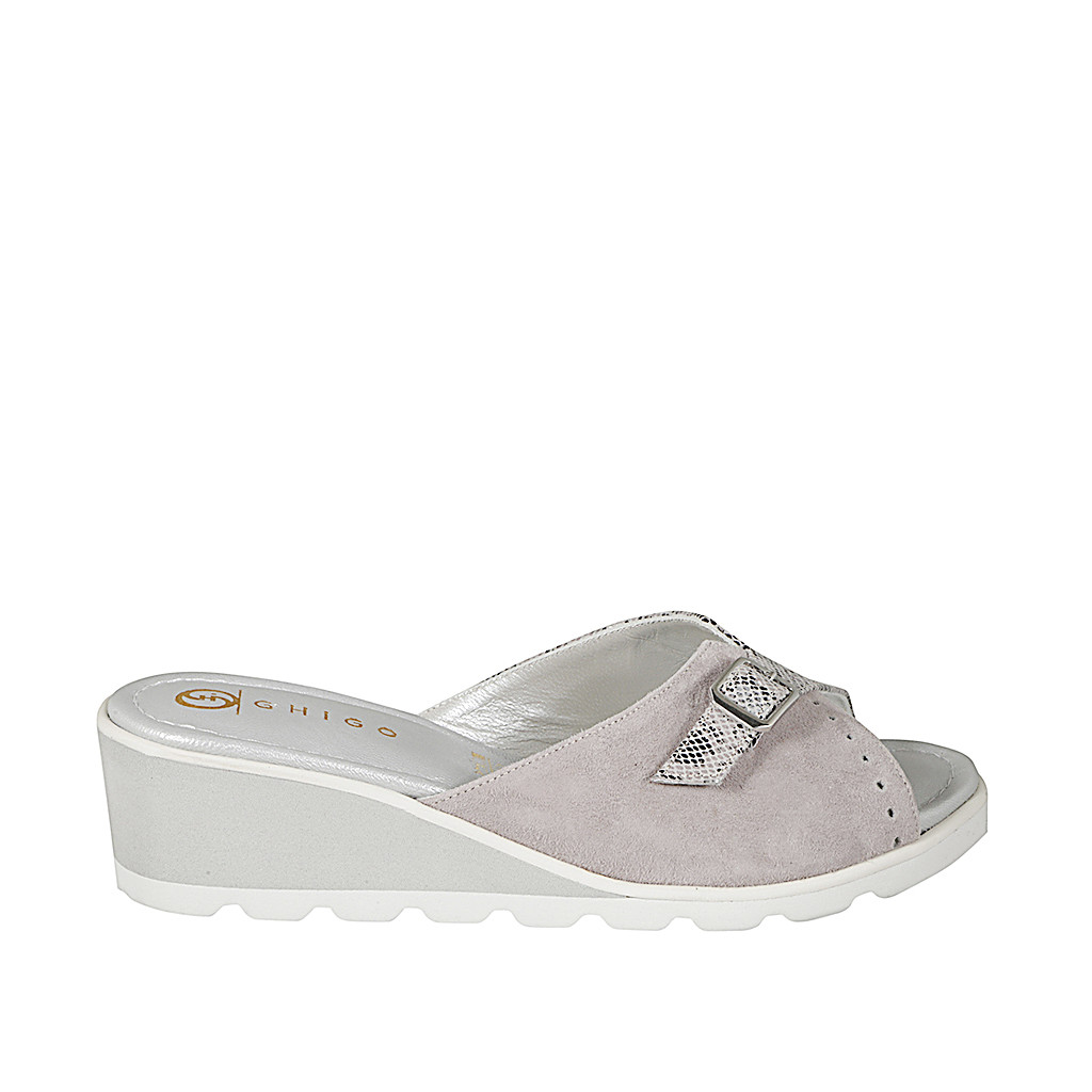Offene Damenpantolette mit Innensohle im Memory-Schaum aus grauem Wildleder und gedrucktem Leder, Plateau und Keilabsatz 5