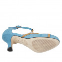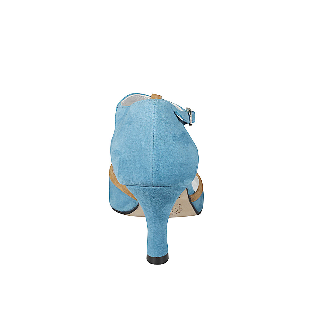 Offener Damschuh mit runder Spitze und T-Steg, aus türkisfarbenem Wildleder und Details aus cognacbraunem Wildleder mit Absatz 7