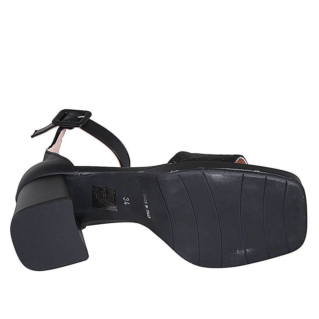 Offener Damenschuh mit Riem und Plateau aus gedrucktes schwarzem Leder Absatz 7