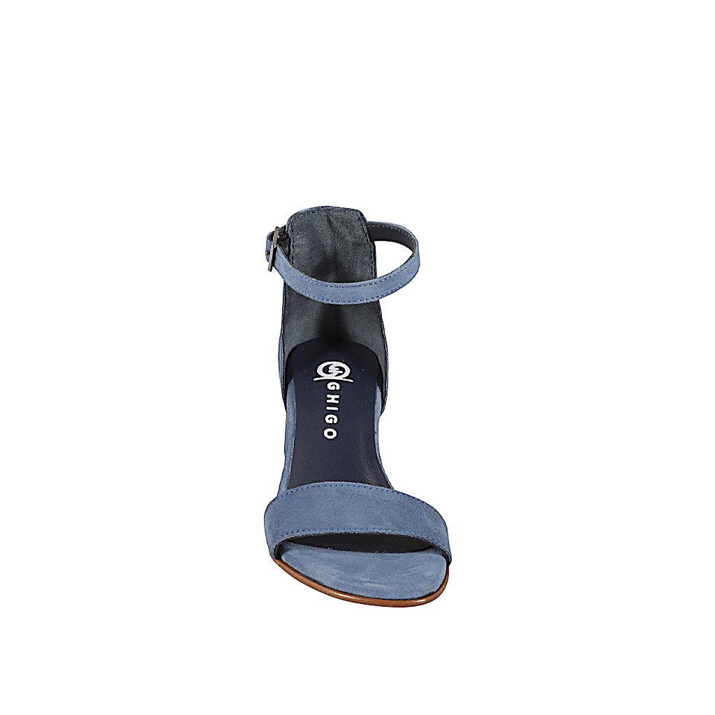 Offene Damenschuhe mit Knöchelriemen und vorderem Riem aus blauem Wildleder Absatz 5