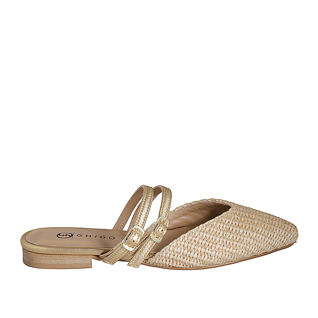 Damenpantolette mit geschlossener Spitze und Riemchen aus beiger Raphia und goldlaminiertem Leder Absatz 2