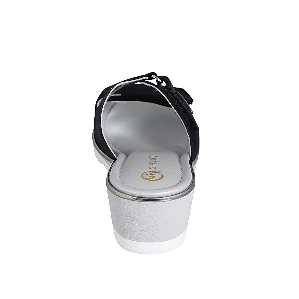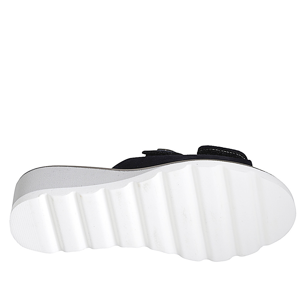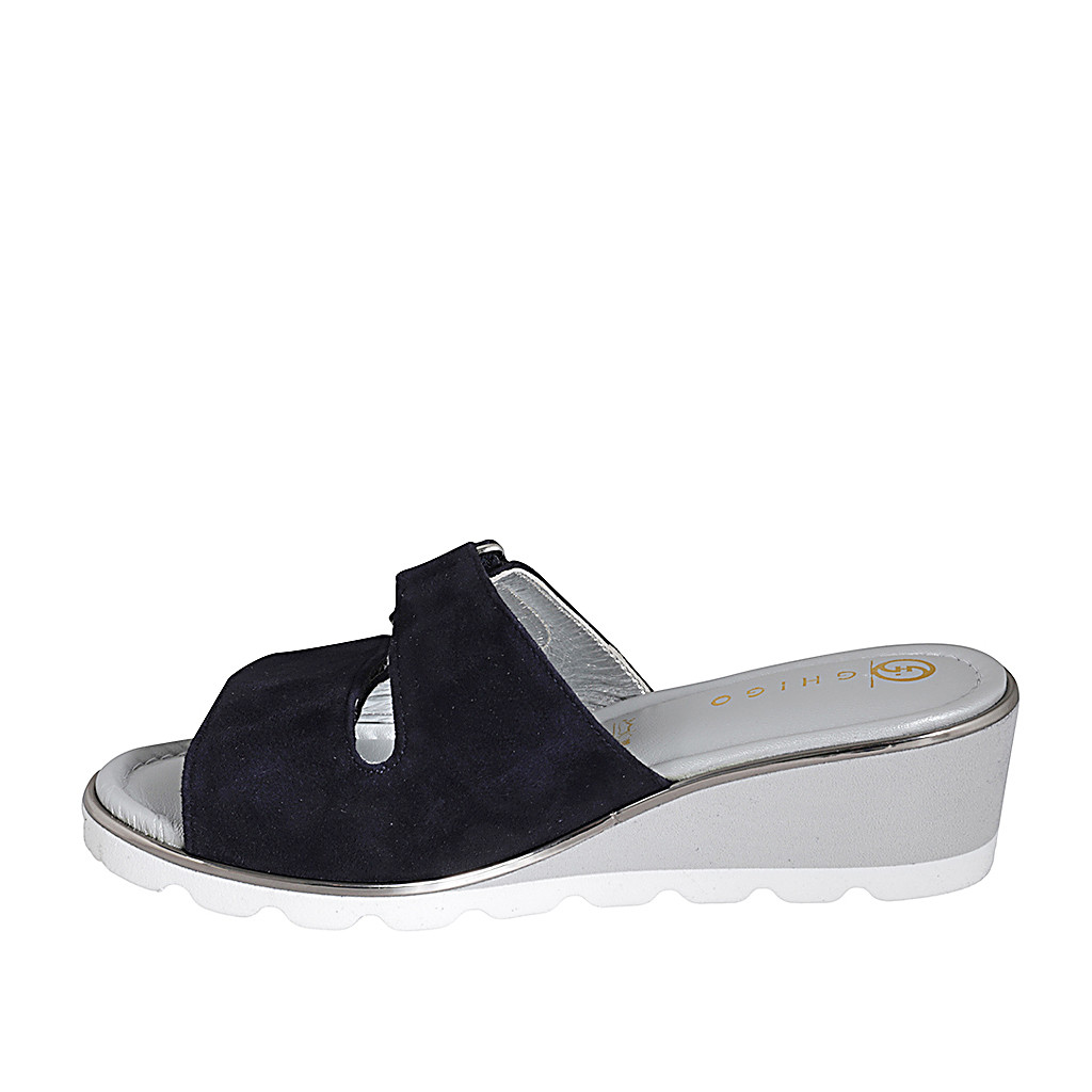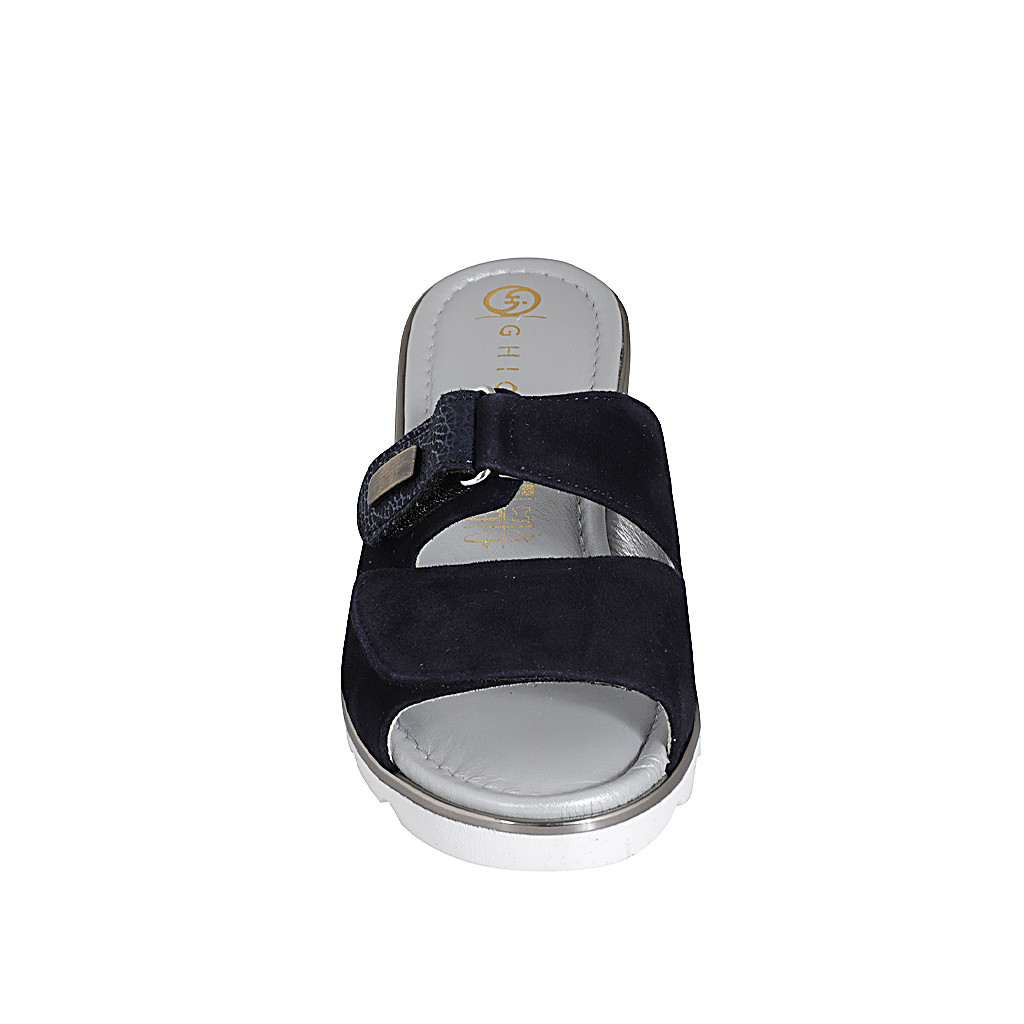 Damenpantoletten aus blauem und blaulaminiertem bedrucktem Wildleder mit Klettverschluss und Keilabsatz 4