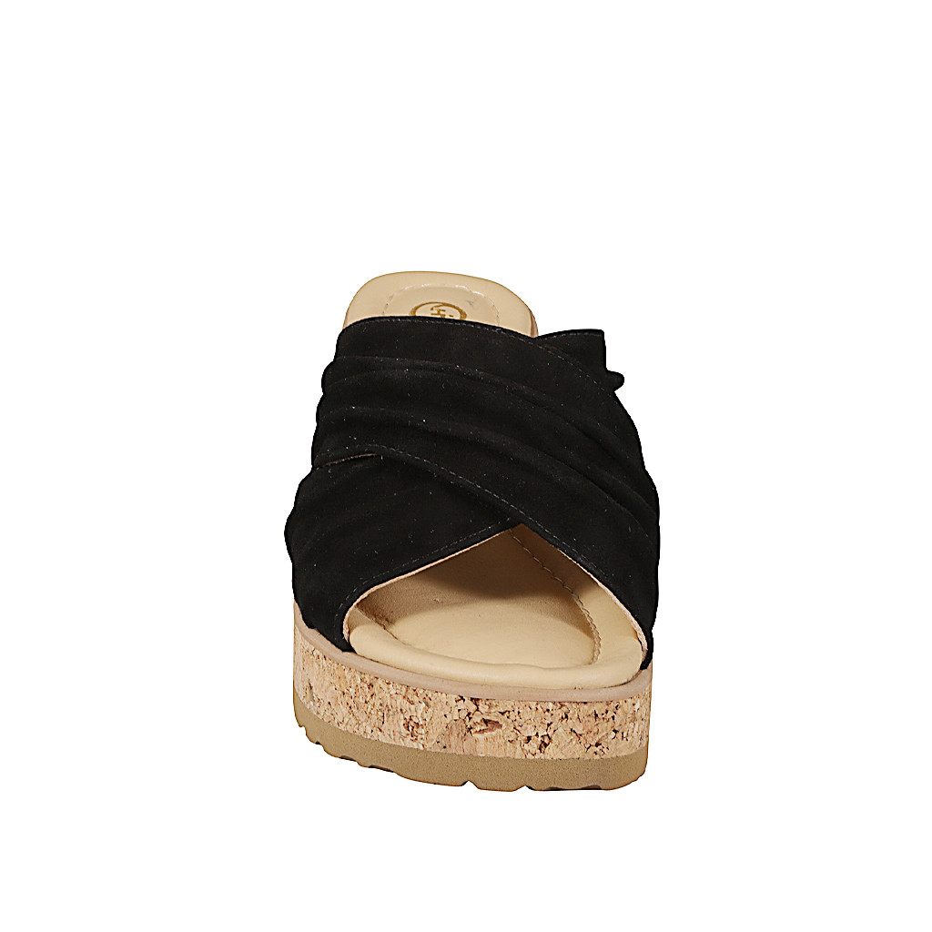 Offene Damenpantolette mit Innensohle im Memory-Schaum und verstellbarem Riemen aus dunkelblauem Wildleder mit Keilabsatz 7
