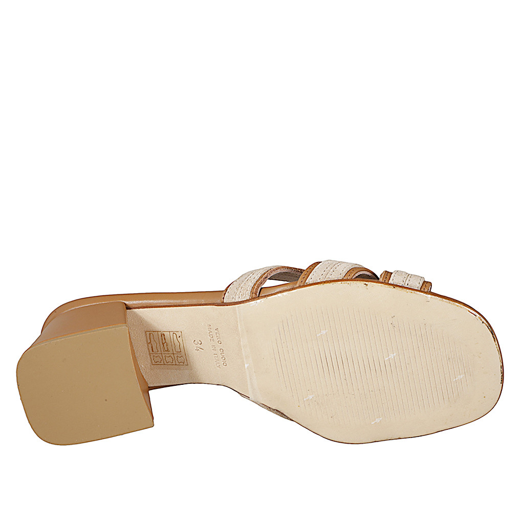 Damenpantoletten mit gekreuztem Riemchen-Design aus cognacbraun Leder und beigem Wildleder, Absatz 5