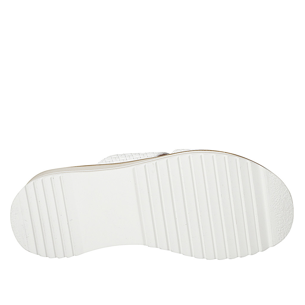 Offene Damenpantoletten mit 2 Bändern mit geometrischem Design und Gummiband aus weißem Leder, Keilabsatz 5