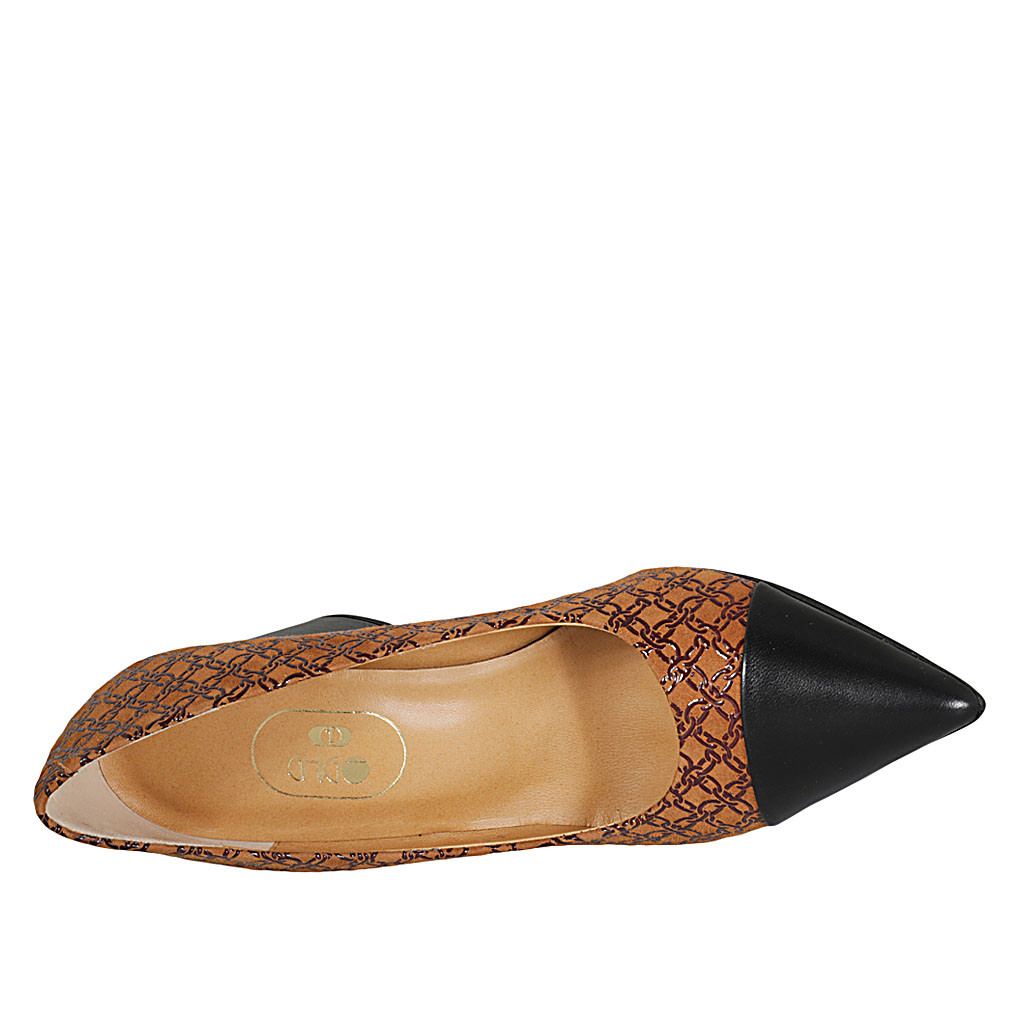 Spitzer Damenpump aus schwarzem Leder und cognacbraunem und braunem bedrucktem Wildleder Absatz 8