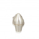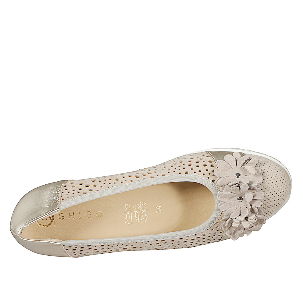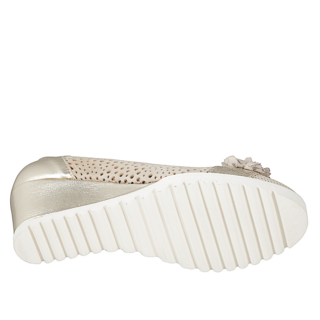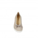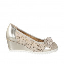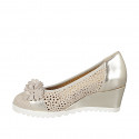 Damenpump mit abnehmbarer Innensohle und Blumendekoration aus beigem Wildleder und platinfarbenem Leder mit Keilabsatz 6