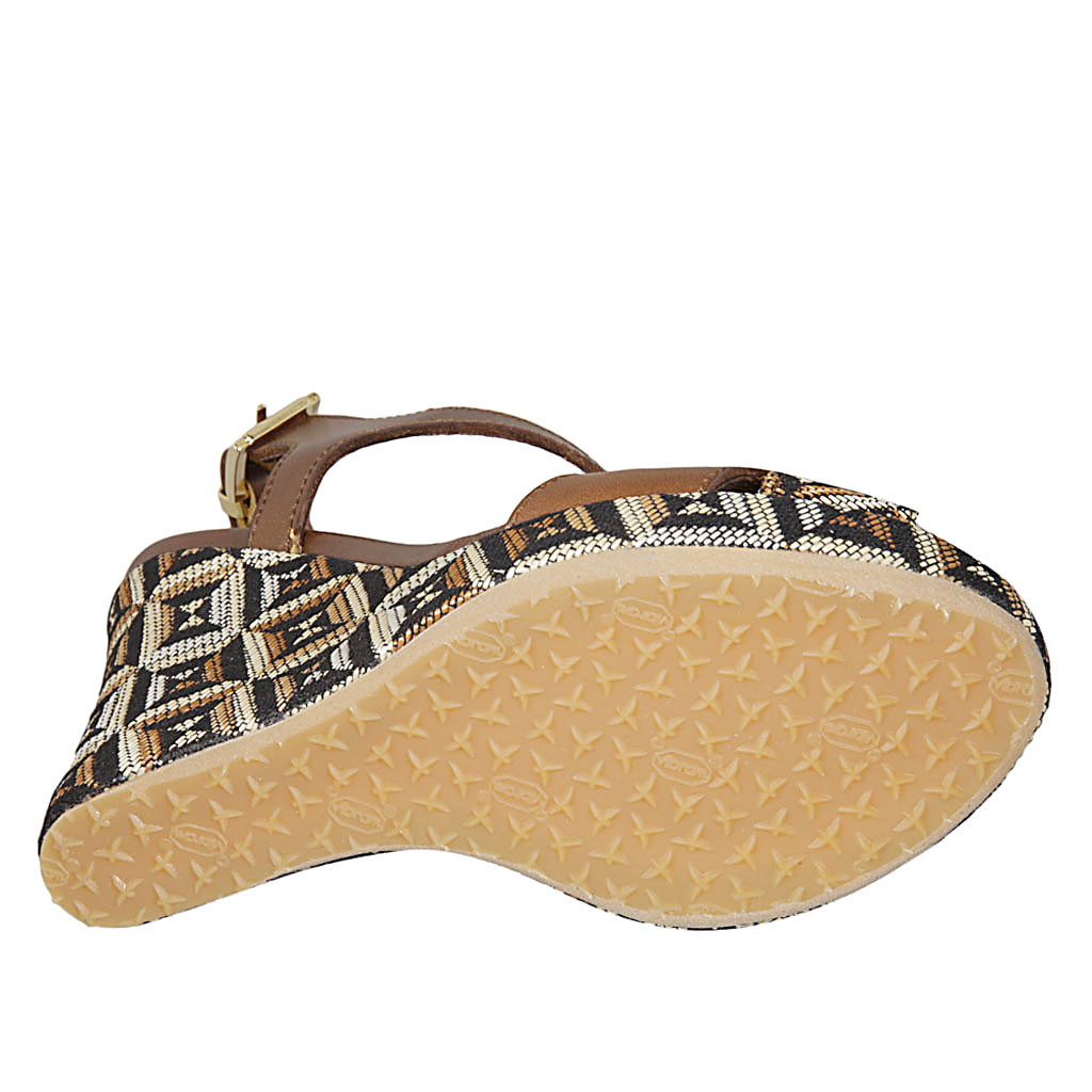 Damensandale mit buntem optischem Plateau aus cognacbraunem Leder Keilabsatz 10