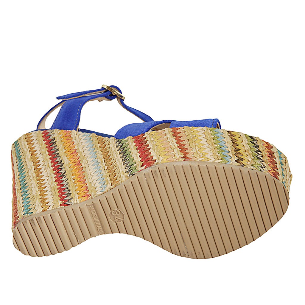 Damensandale mit Plateau und Riem aus kornblumenblauem Wildleder und buntem Stoff Keilabsatz 12 - Verfügbare Größen:  31, 33, 34, 42, 43, 44