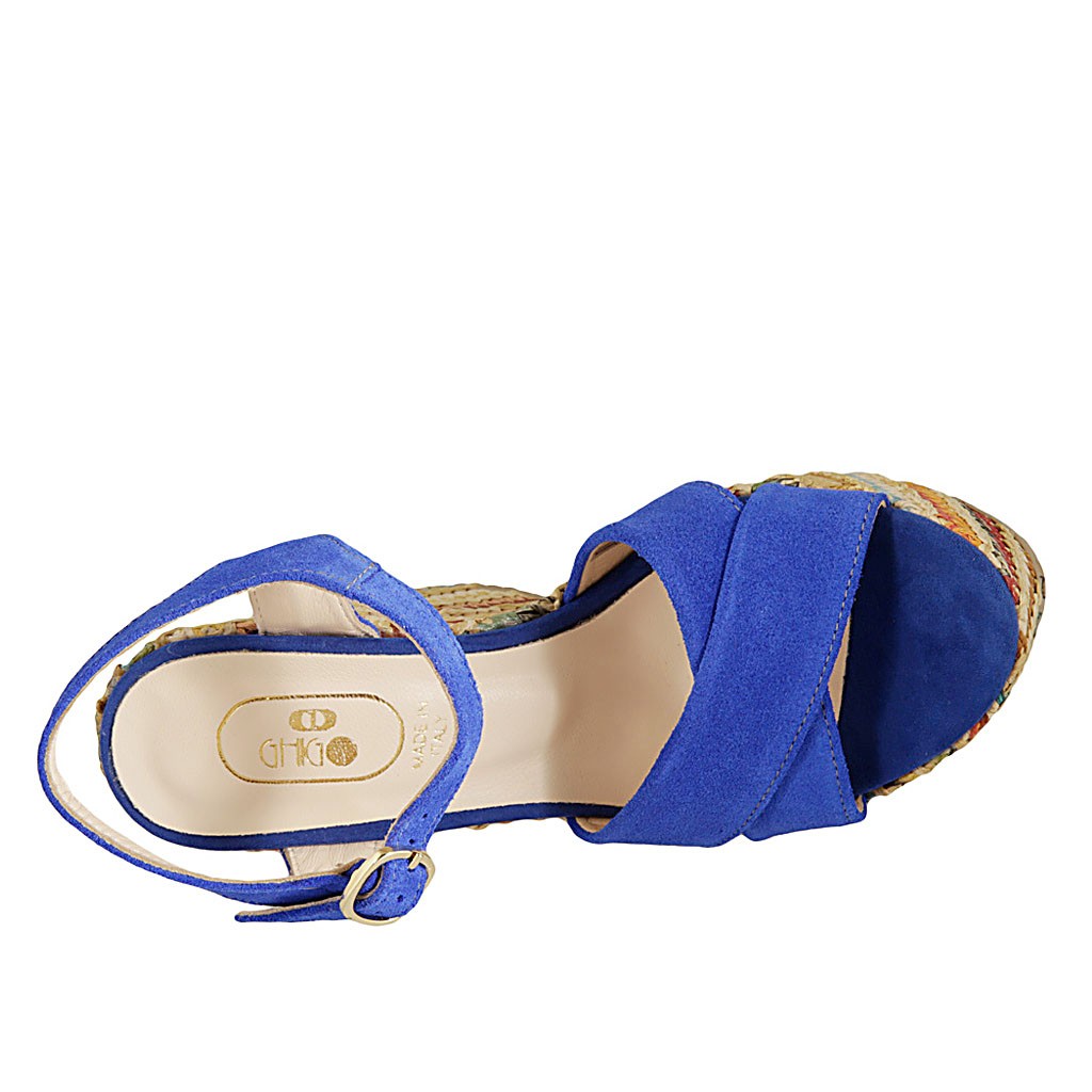 Damensandale mit Plateau und Riem aus kornblumenblauem Wildleder und buntem Stoff Keilabsatz 12