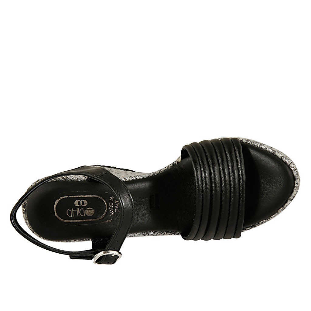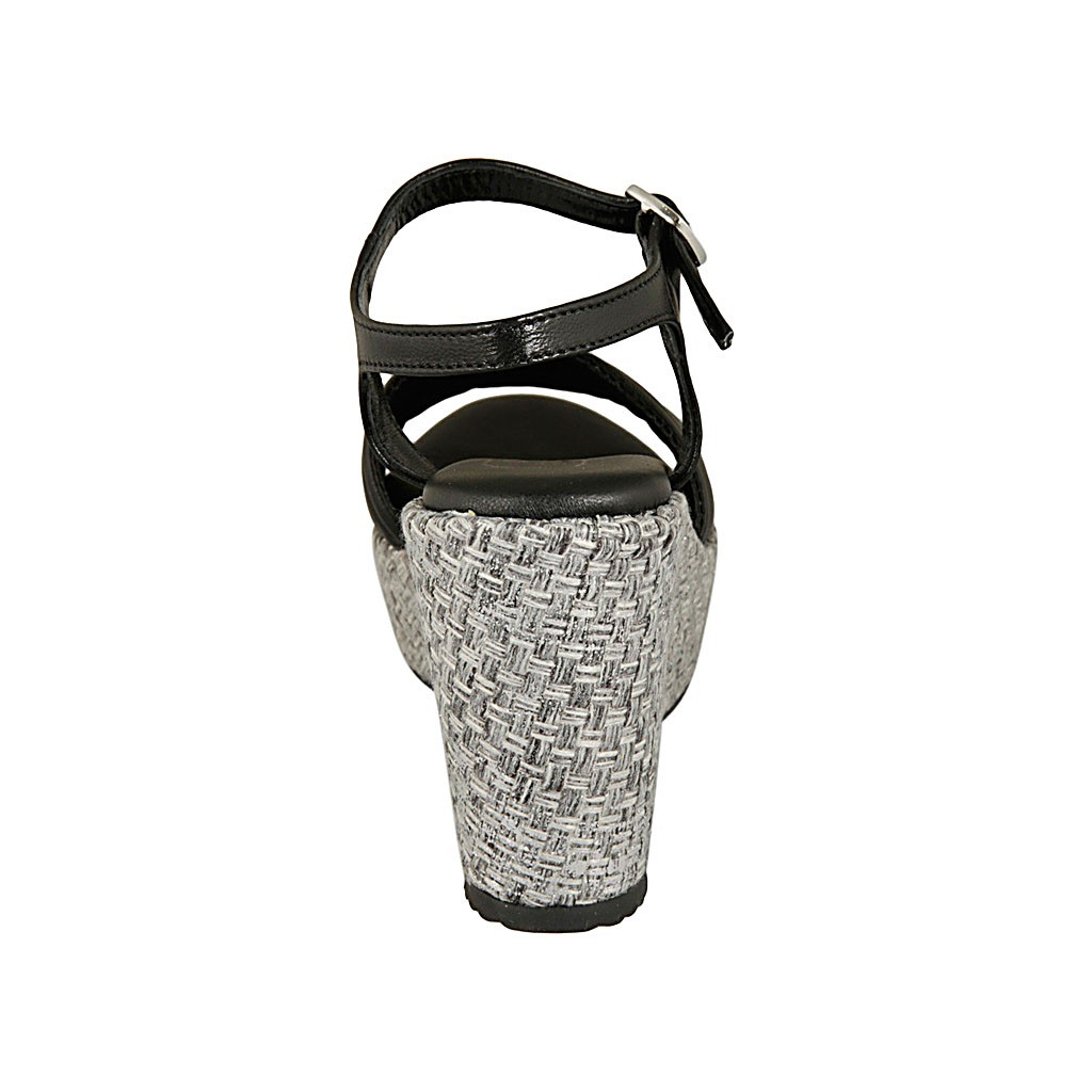 Damenriemsandale mit Plateau aus schwarzem Leder und grauem Stoff Keilabsatz 9