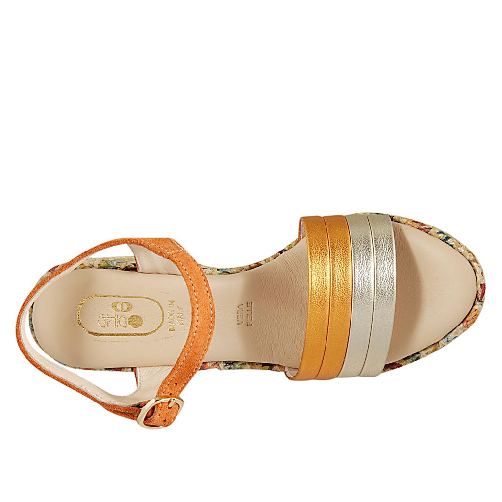 Fabelhafte Damensandalen aus laminiertem Leder und orangefarbenem Wildleder mit verstellbarem Knöchelriemen und buntem gewebtem Keilabsatz in Bast-Optik ... ein bequemes und trendiges Modell.