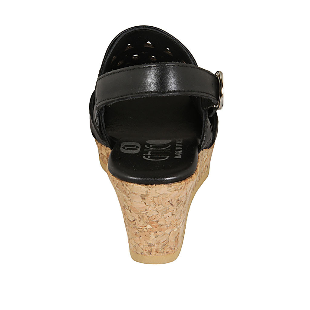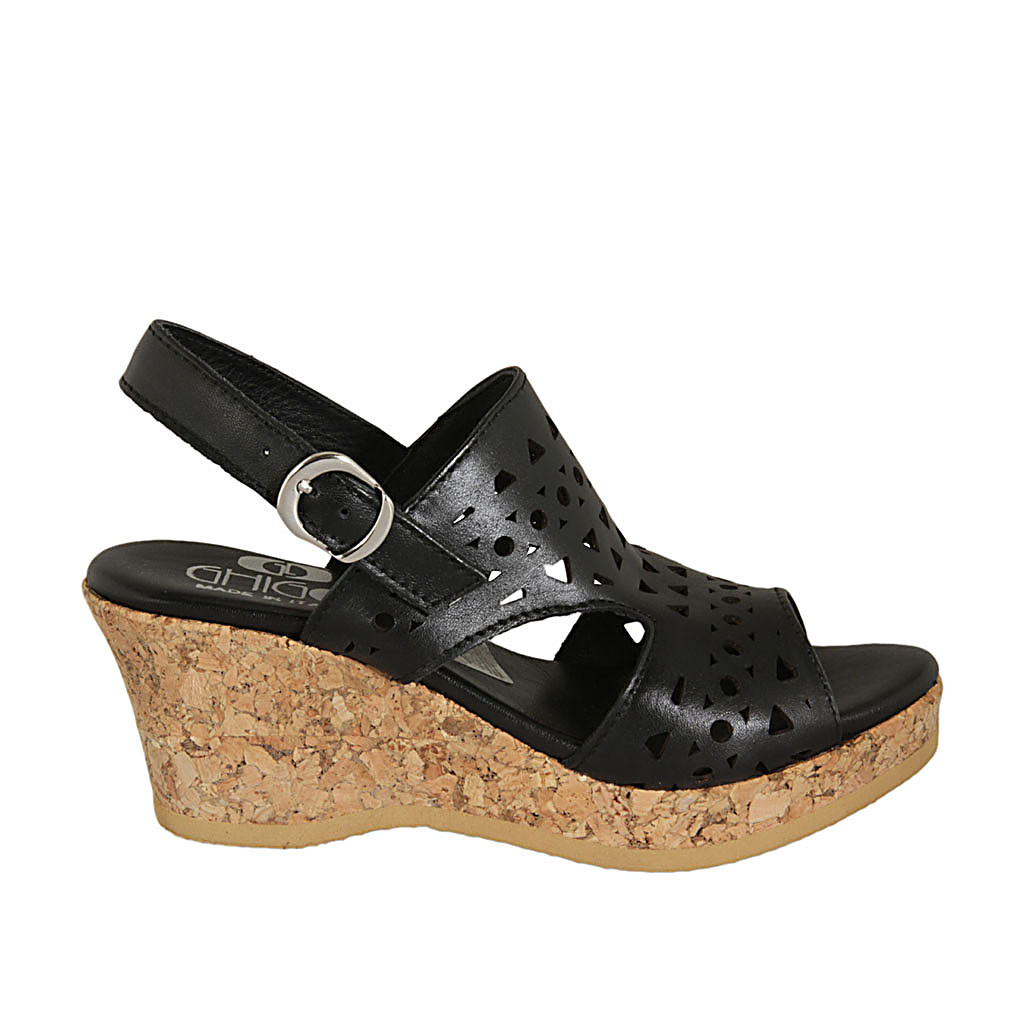 Damensandale aus schwarzem perforiertem Leder mit Plateau und Keilabsatz 7