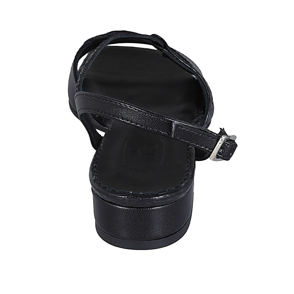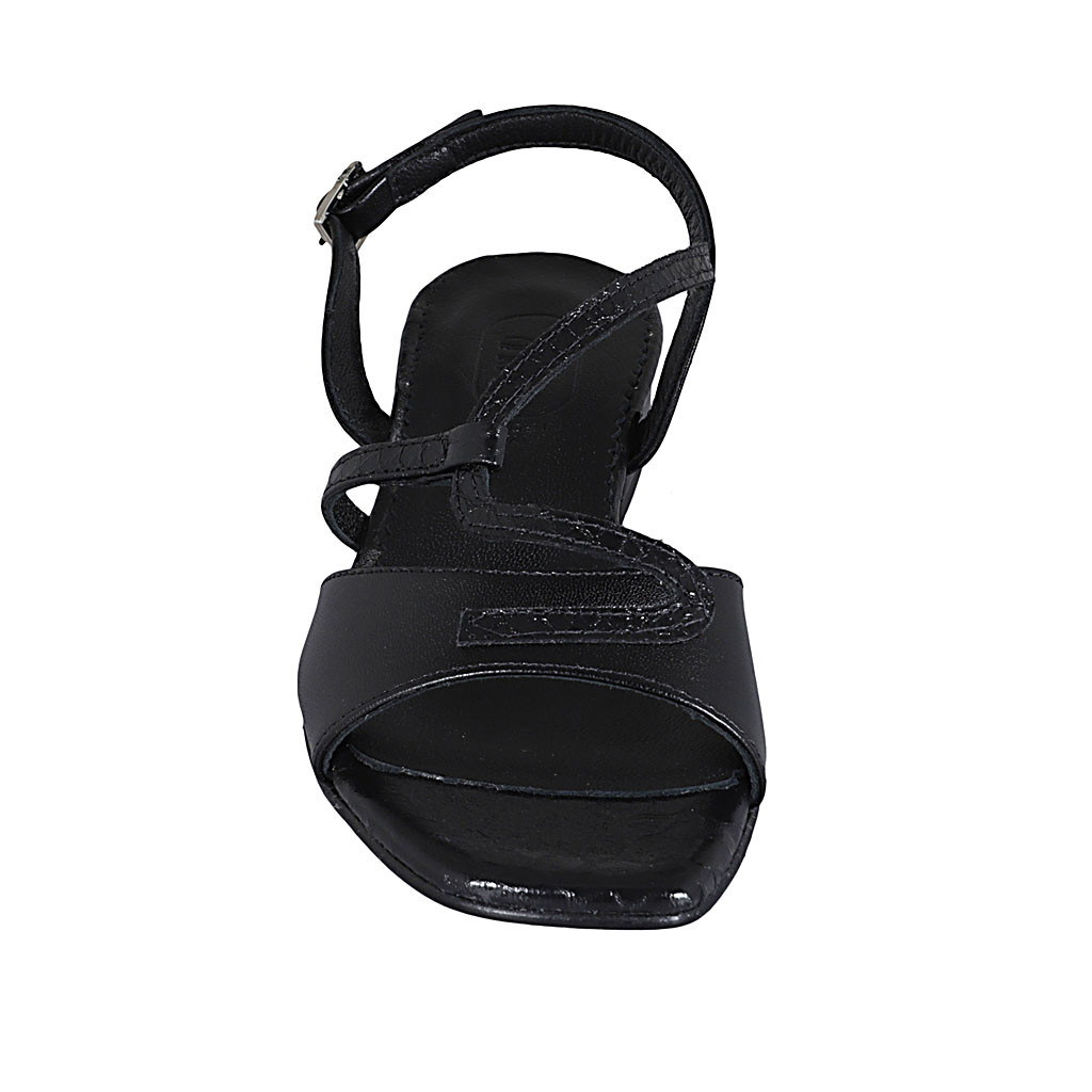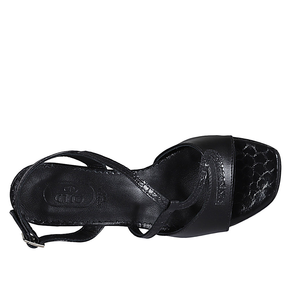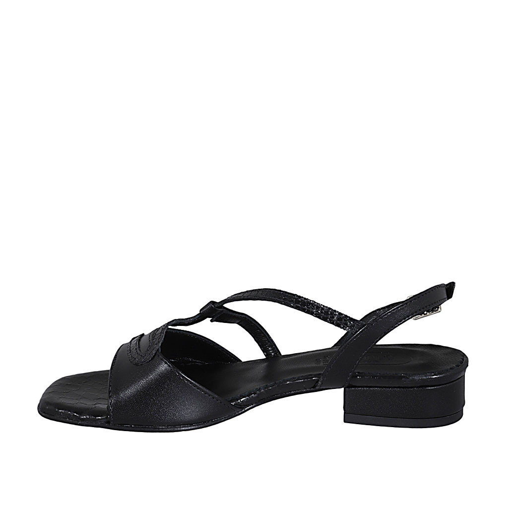 Damensandale aus schwarzem laminiertem und gedrucktem Leder Absatz 2