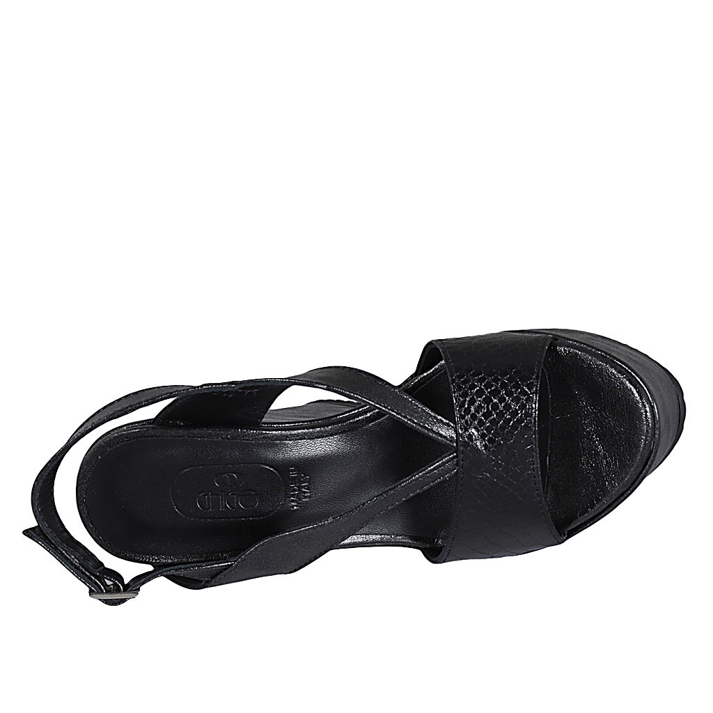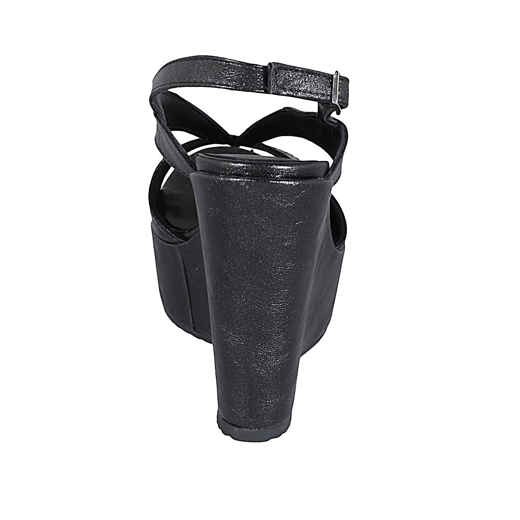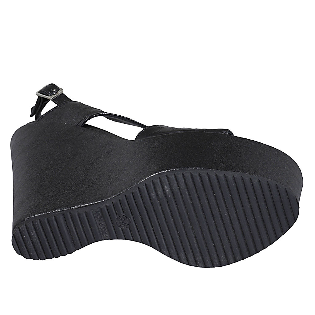 Damensandale aus schwarzlaminiertem bedrucktem Leder mit Plateau und Keilabsatz 12