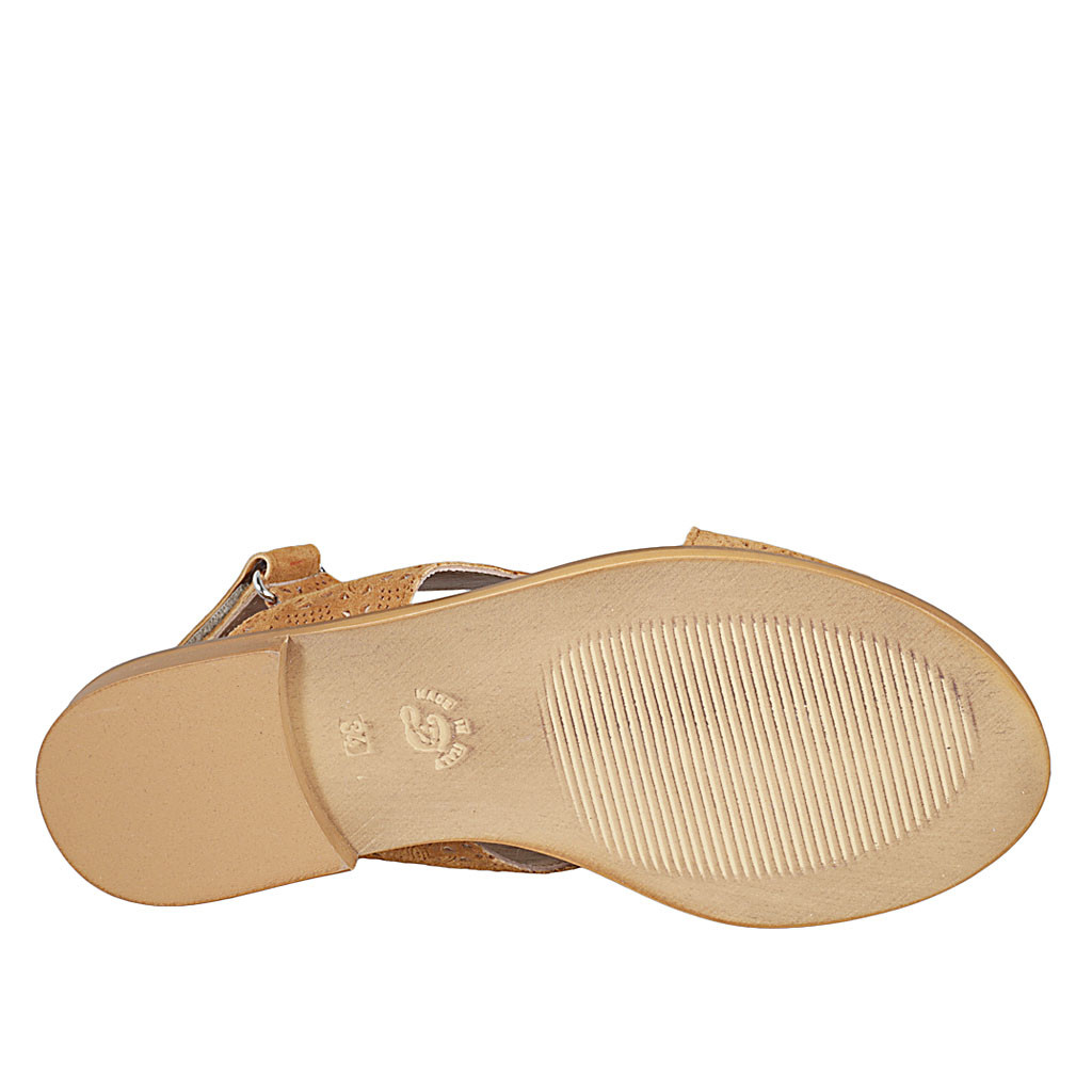 Damensandale mit Klettverschluss aus cognacbraunem perforiertem Wildleder Absatz 1