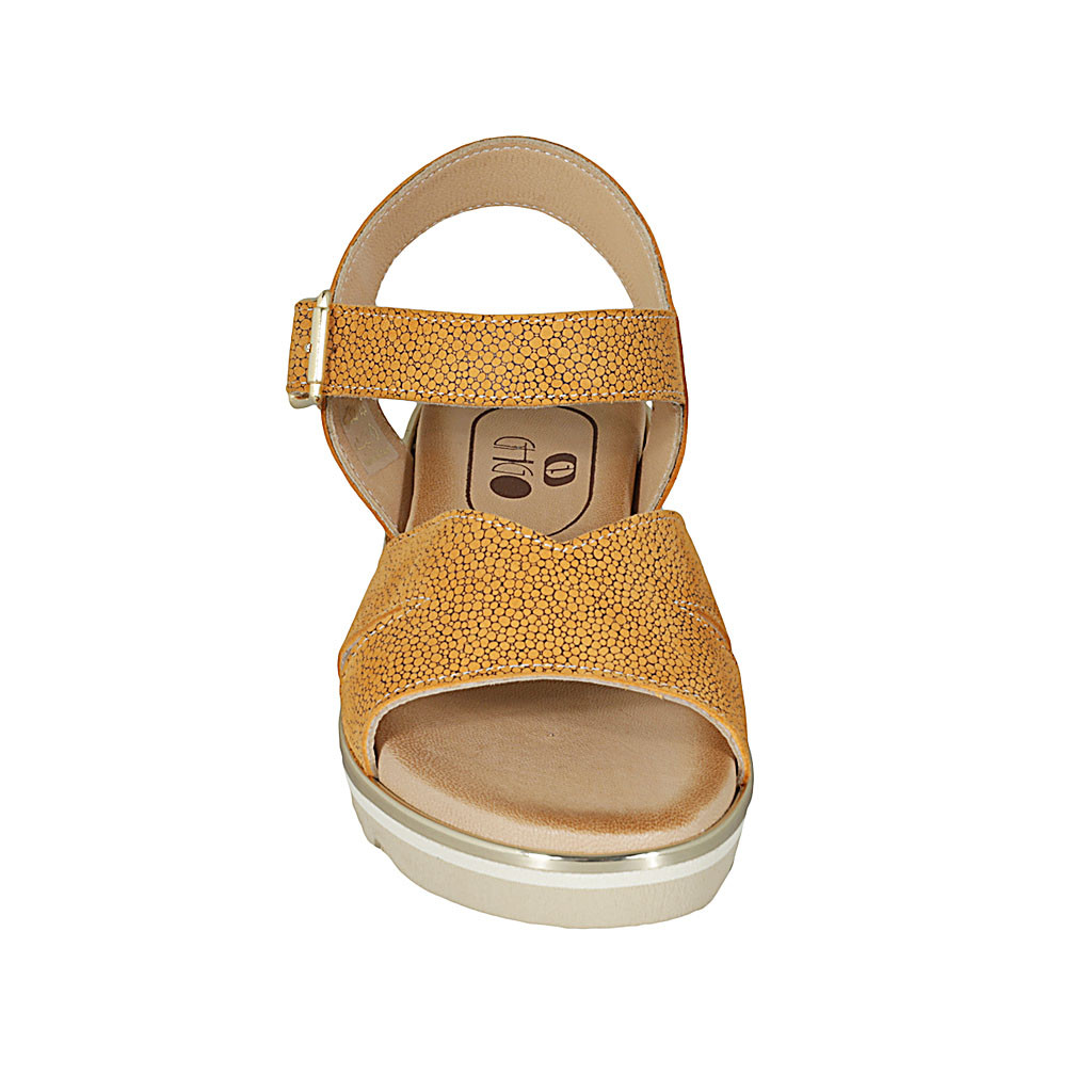 Damensandale aus orangenem bedrucktem Leder mit Riem Keilabsatz 3