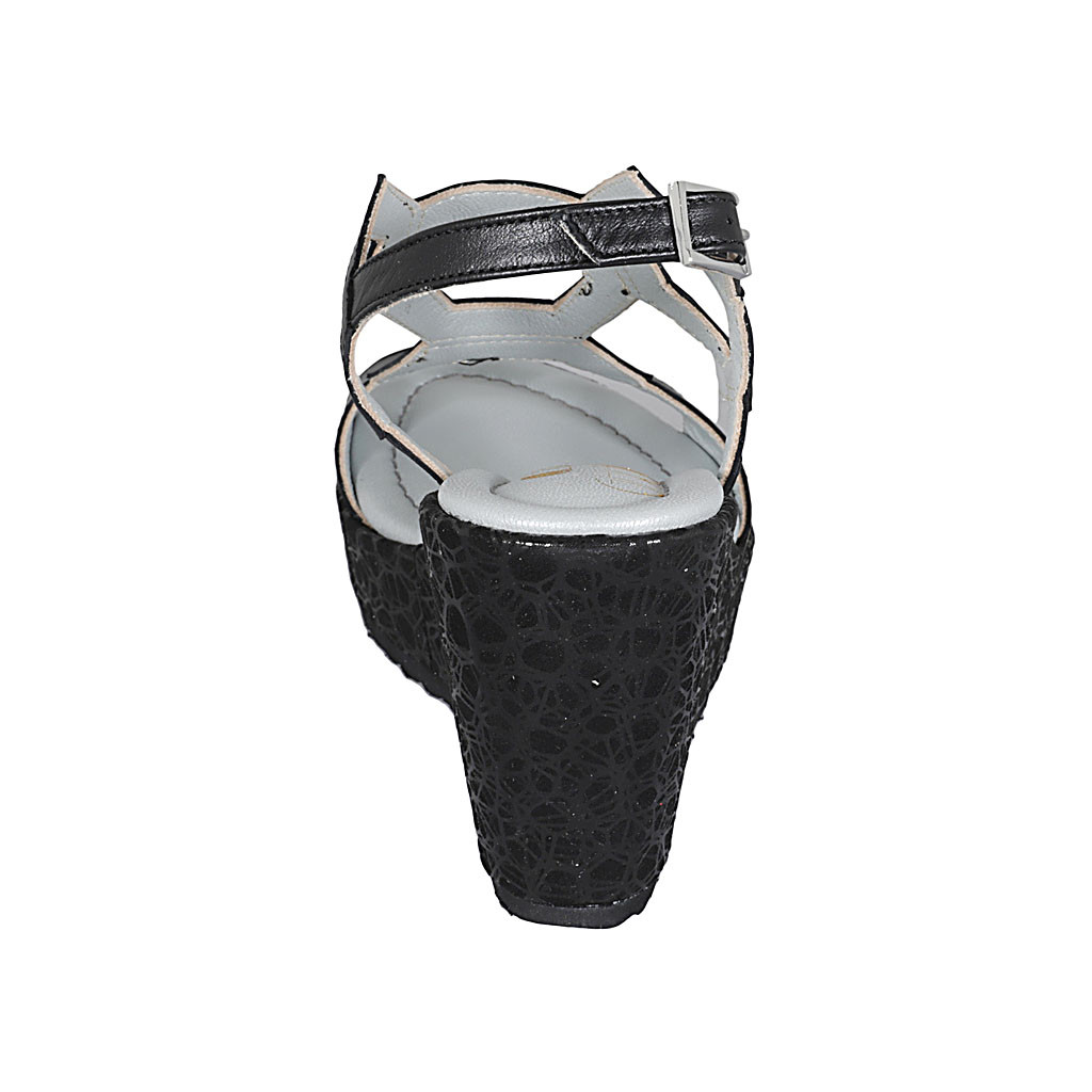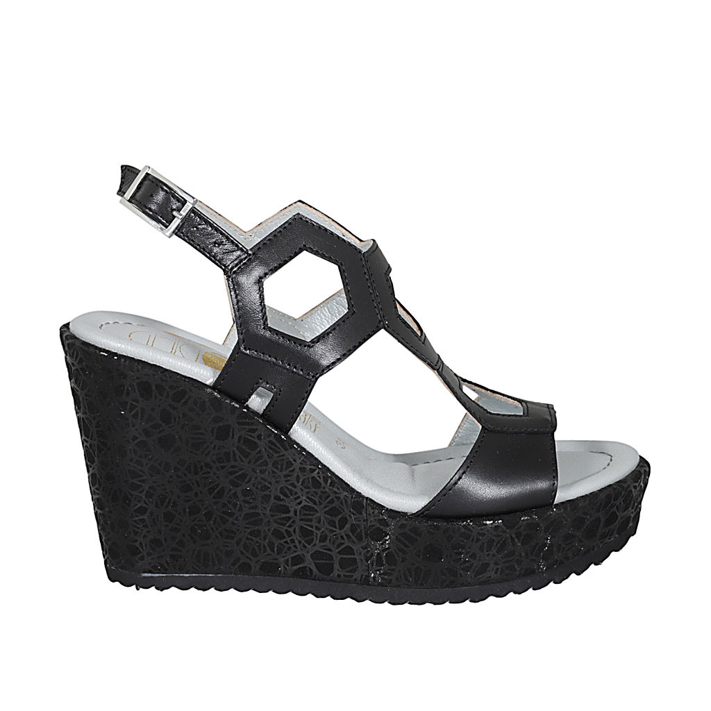 Damensandale mit Plateau aus schwarzem Leder und laminiertem Stoff Keilabsatz 9