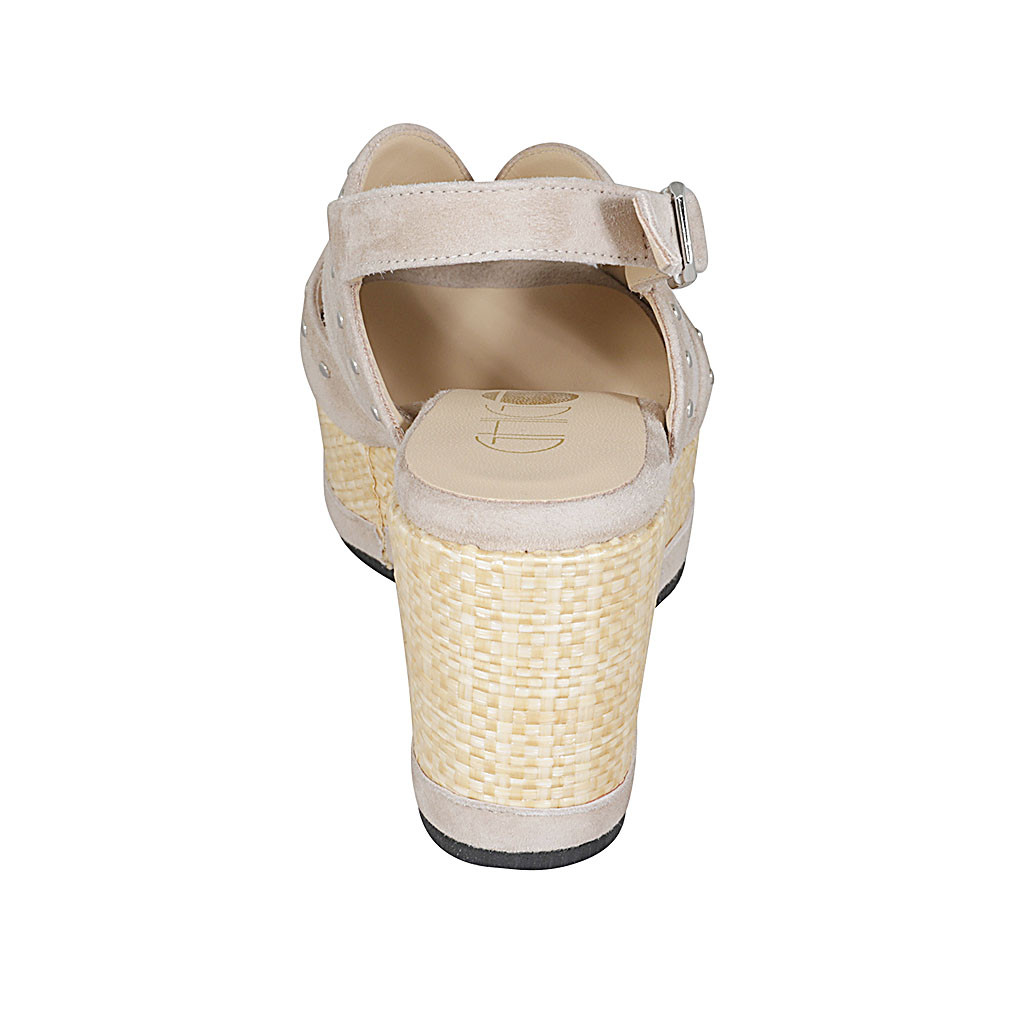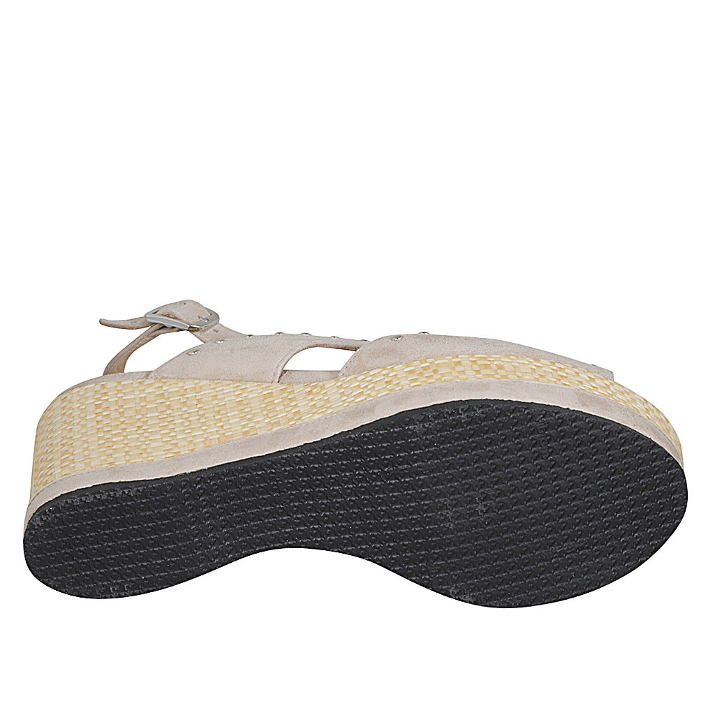 Damensandale aus taupefarbenem Wildleder mit Nieten, Plateau und Keilabsatz 7