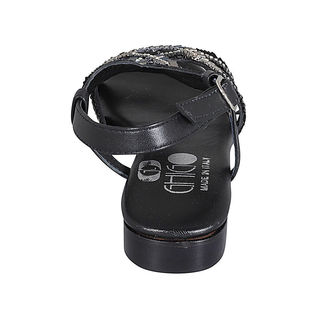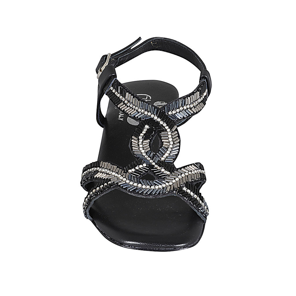 Damensandale aus schwarzem Leder mit Strasssteinen und Absatz 2