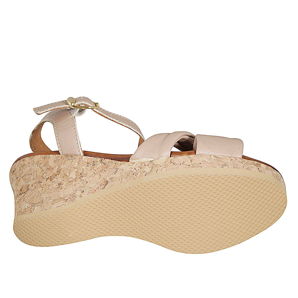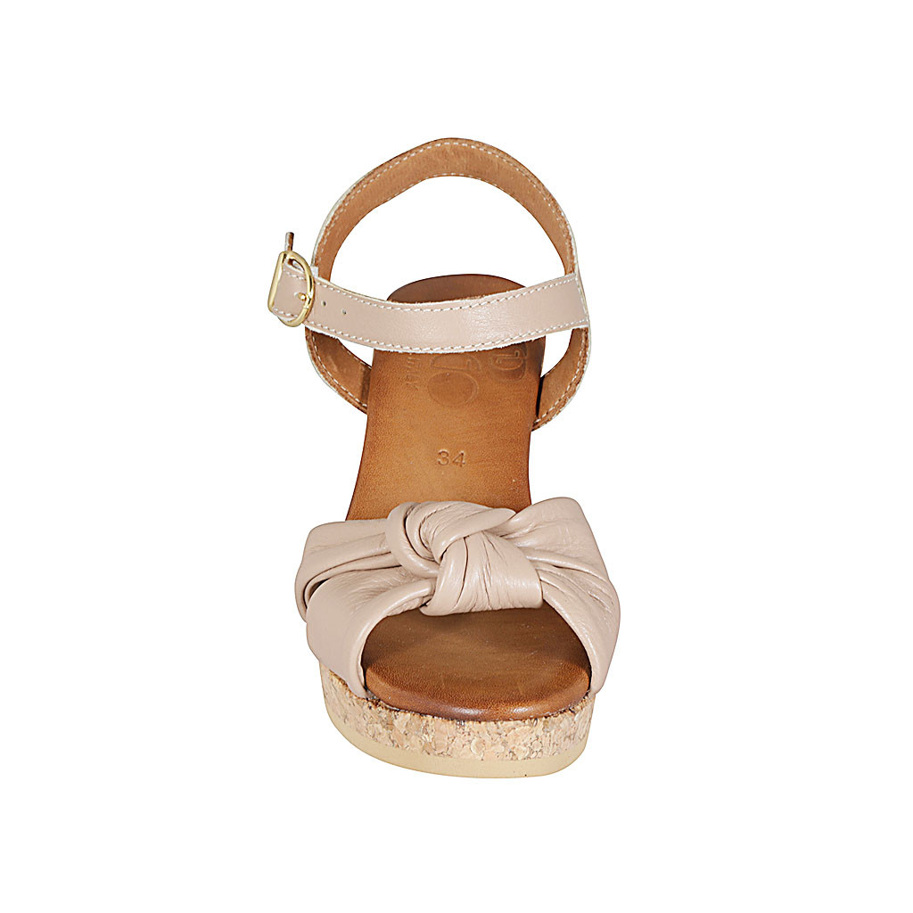 Damensandale mit Riem, Plateau und Knoten aus hellrosafarbenem Leder Keilabsatz 7