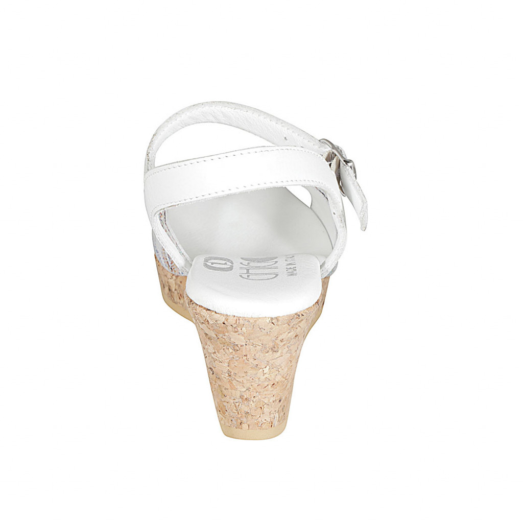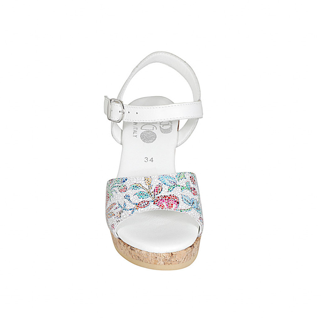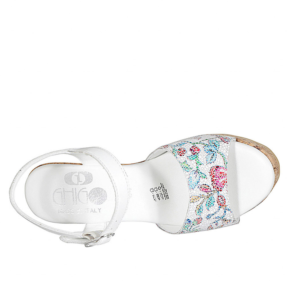 Damensandale aus weißem buntem mosaikbedrucktem Leder mit Riem, Plateau und Keilabsatz 7