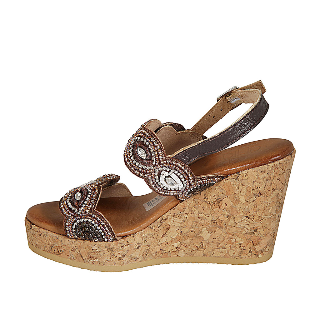 Damensandale aus braunem Leder mit Klettverschlüssen, Perlchen und Keilabsatz 9