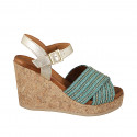 Damensandale aus platinfarbenem Leder und türkisfarbenem Stoff mit kleinen platinfarbenen Einsätzen und Perlen, Keilabsatz 9