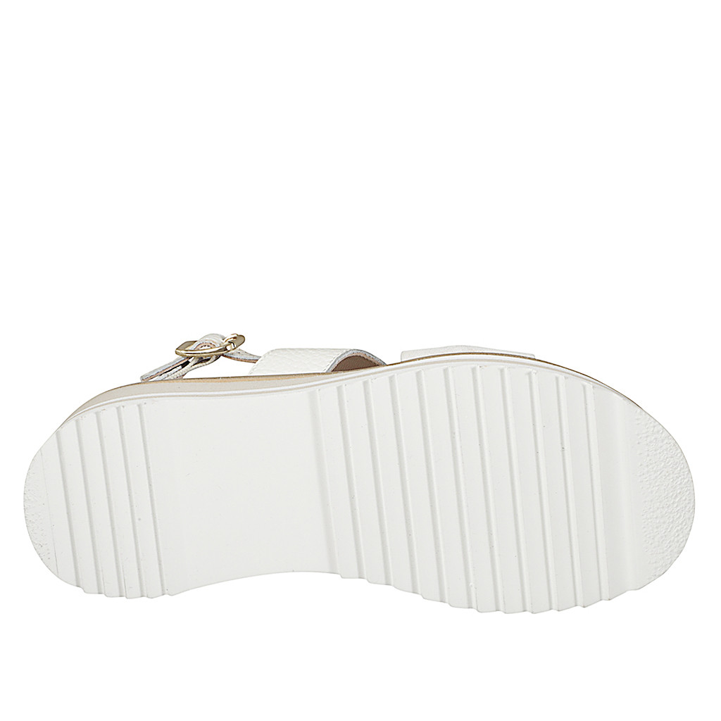 Damensandale mit 2 Bändern und Knot aus elfenbeinfarbenem Leder und laminiertem platinfarbenem Wildleder, Keilabsatz 5