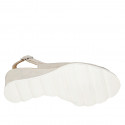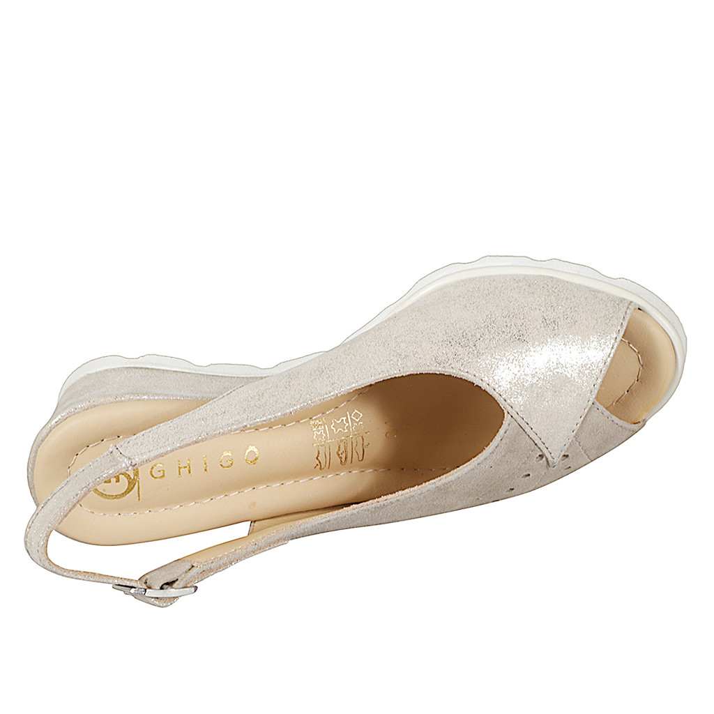 Damensandale mit Innensohle im Memory Foam aus perforiertem beigem Wildleder und platinfarbenem Leder mit Keilbasatz 6