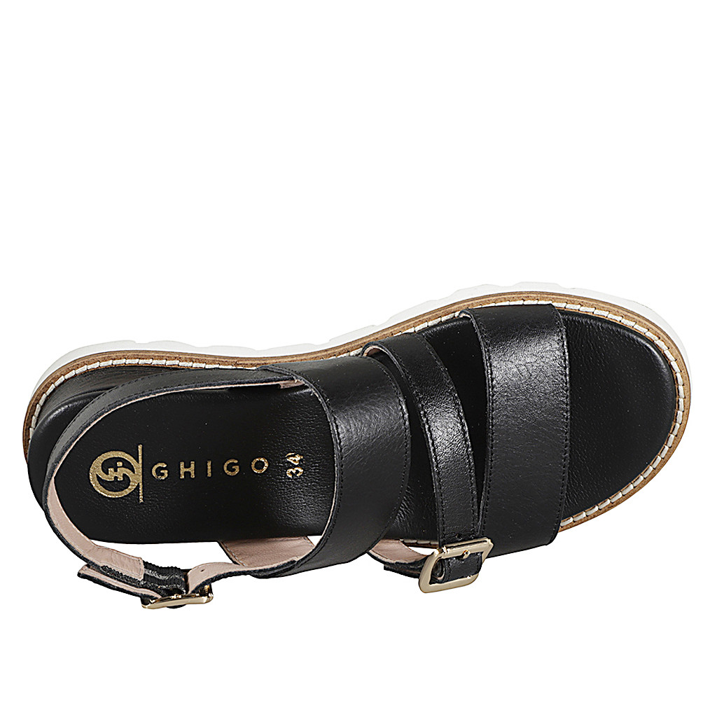 Damensandale mit Leder bedecktem Keilabsatz und Schnalle aus schwarzem Leder, Keilabsatz 3
