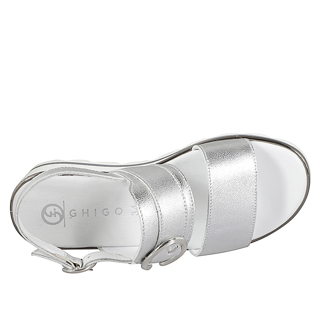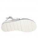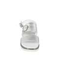 Damensandale mit 2 Bändern und Schnalle aus laminiertem silbernem Leder, Keilabsatz 4