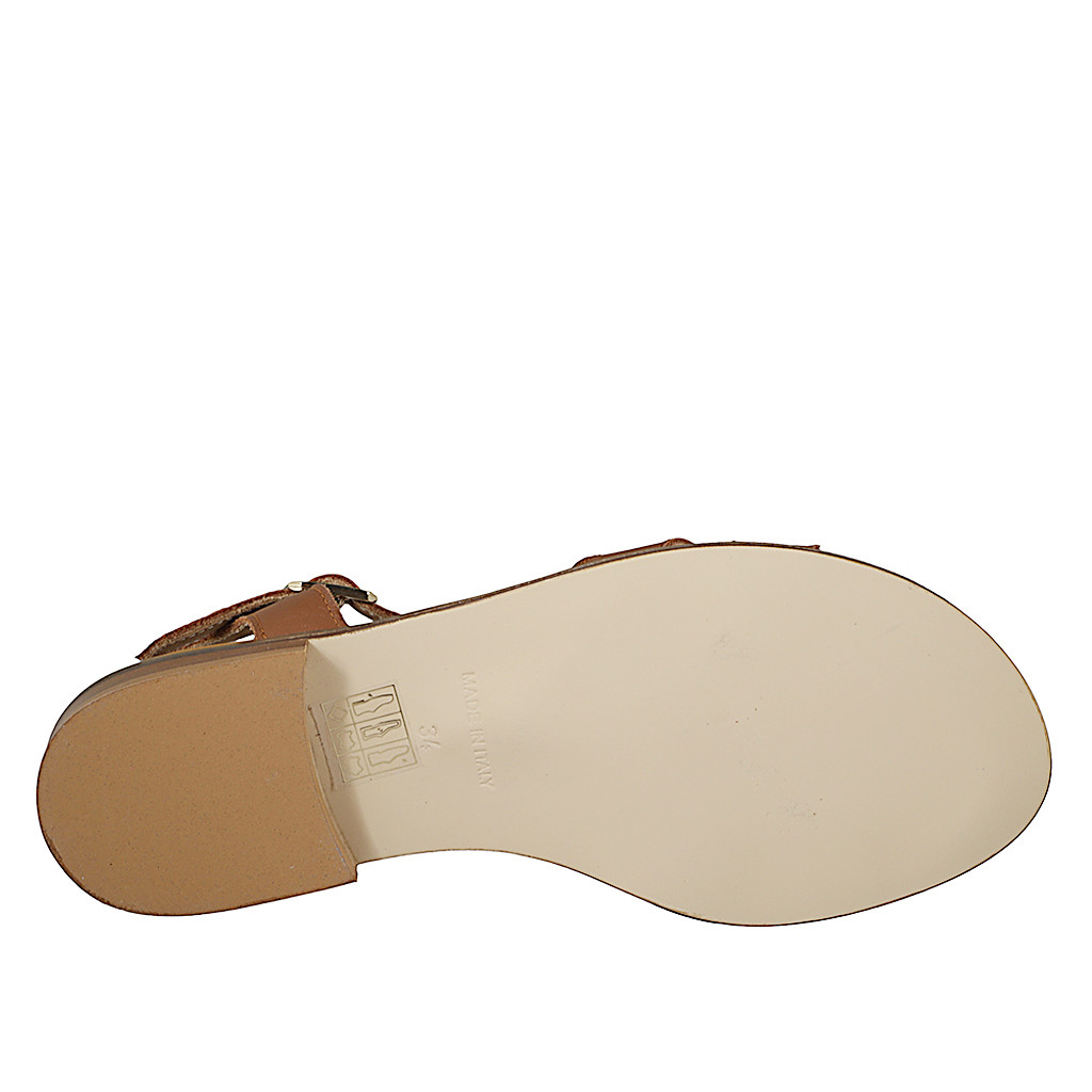 Damensandale mit T-Riemchen, aus cognacbraunem Leder mit goldenen Nieten und Absatz 2