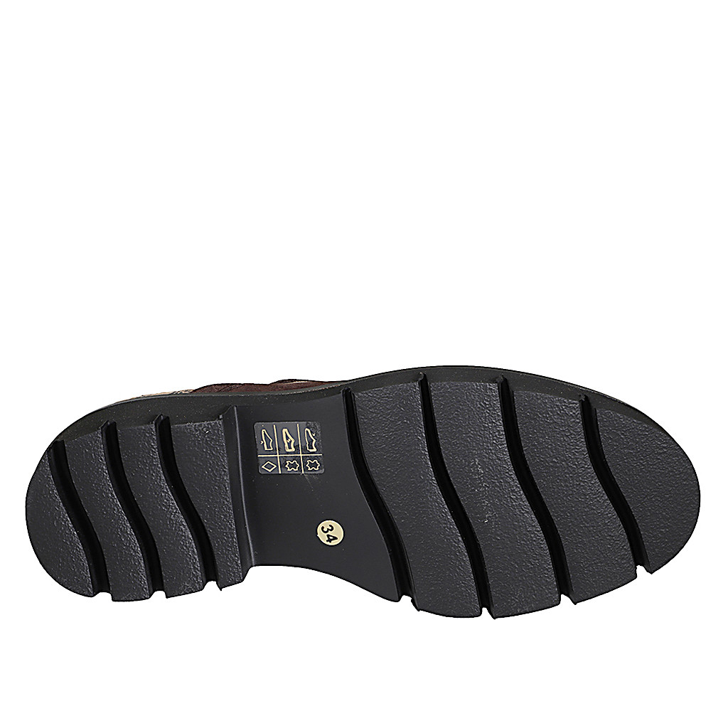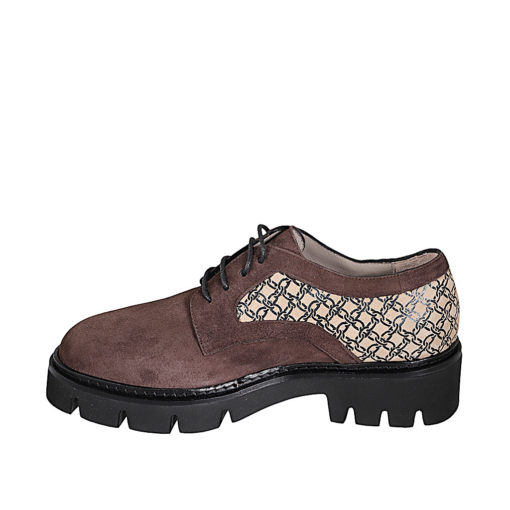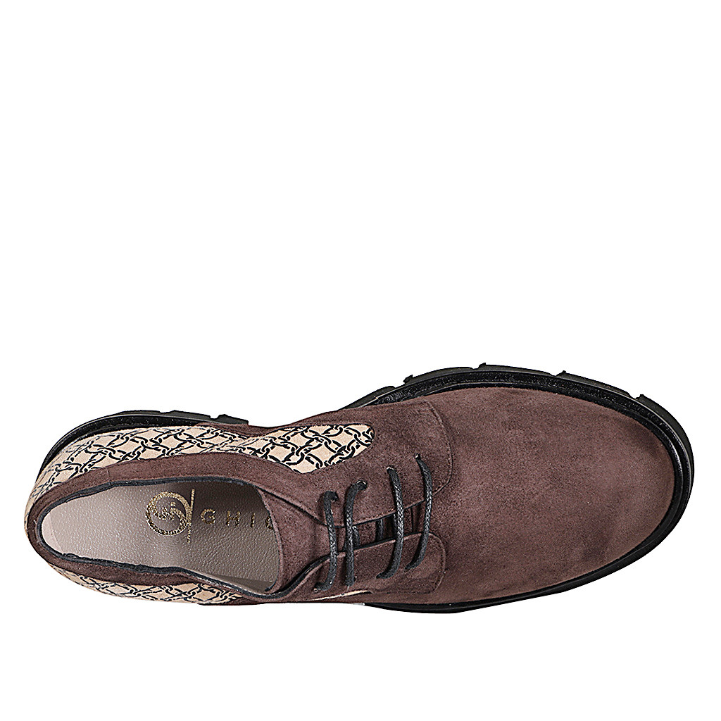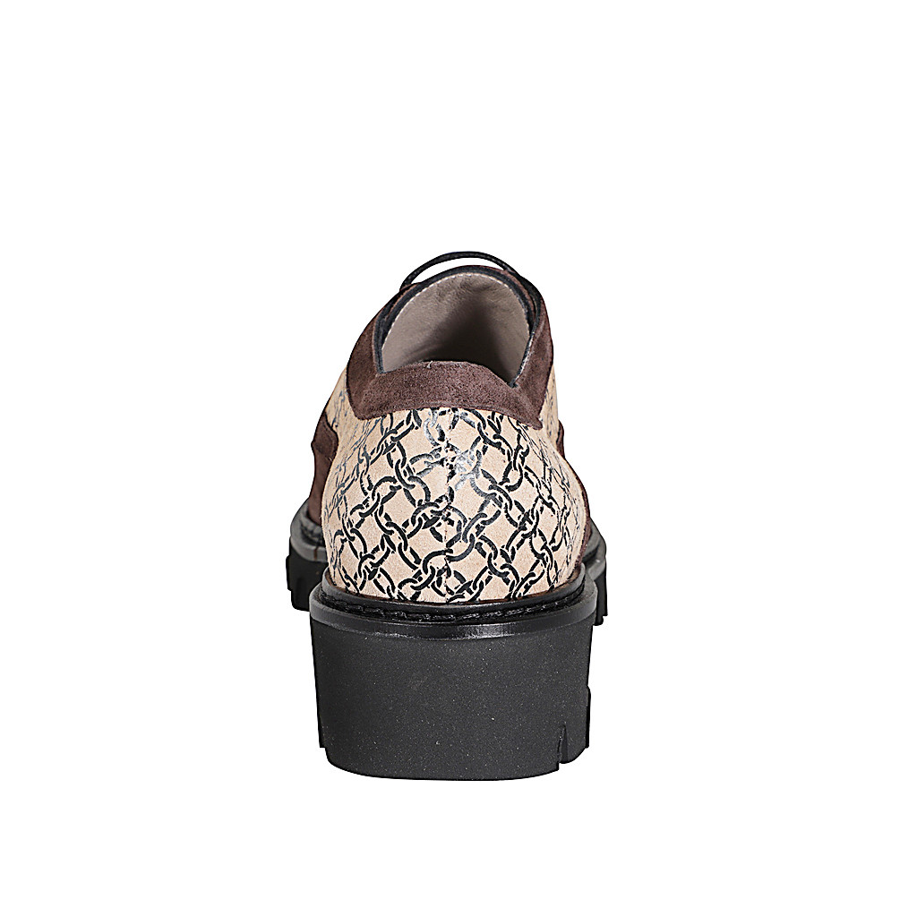 Damenderbyschuh mit Schnürsenkeln aus braunem und beigebedrucktem Wildleder Absatz 4
