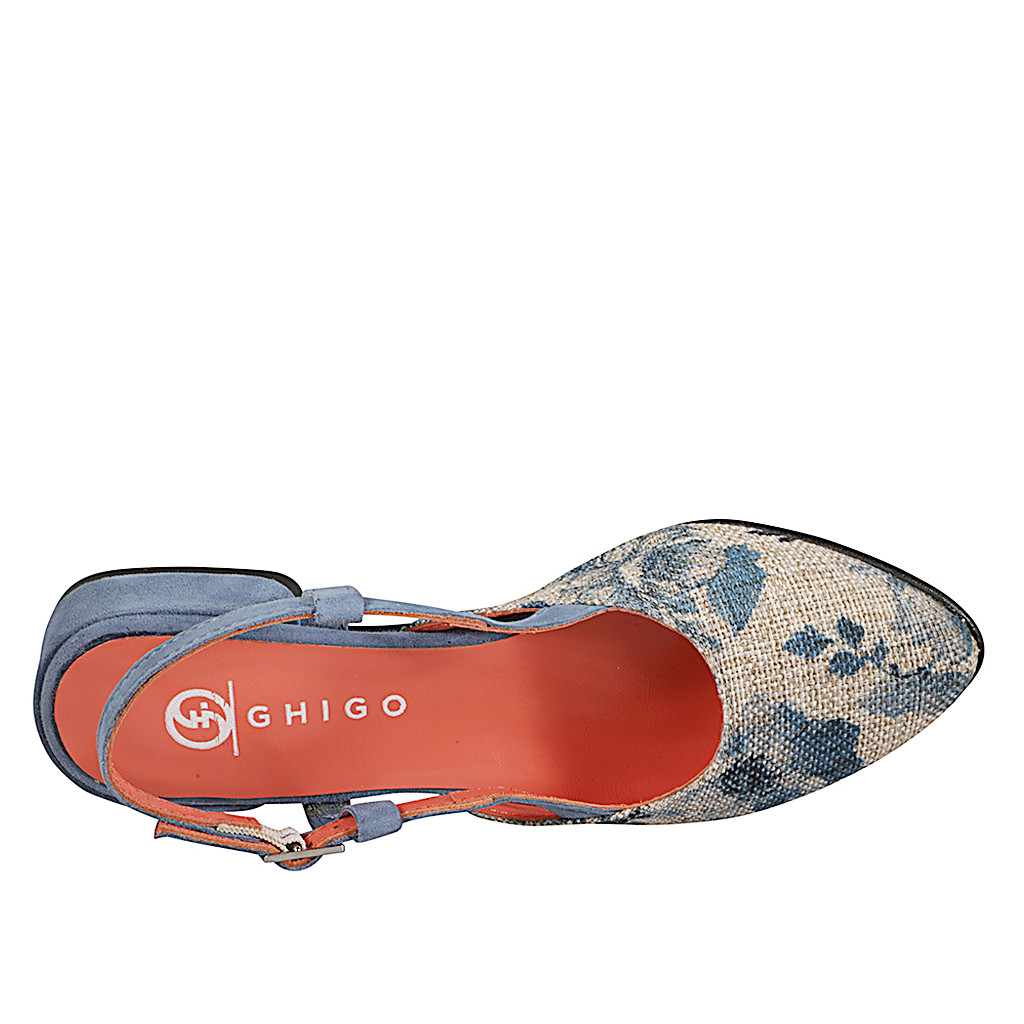 Slingback für Damen mit spitziger Spitze aus blauem Wildleder und Seilstoff mit blauem Blumendruck Absatz 2